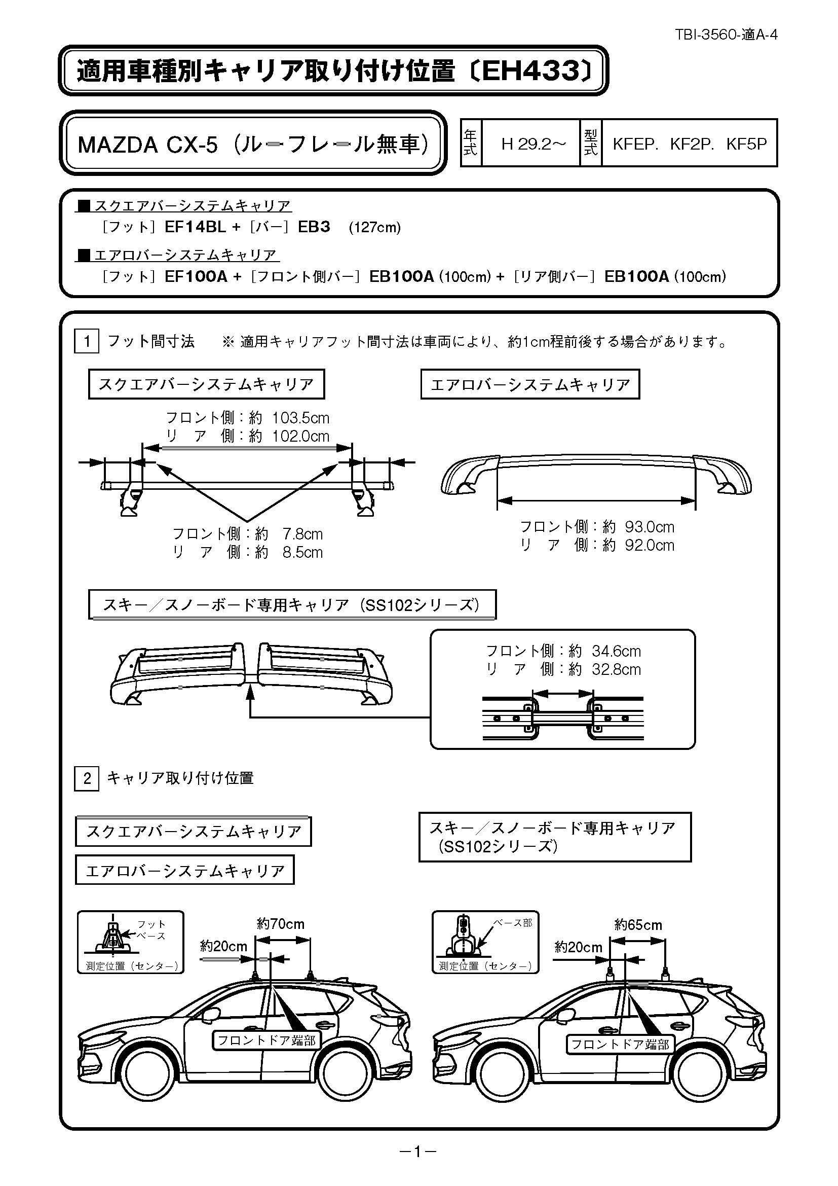 適用車種1:MAZDA CX-5(ルーフレール無車) 【年式:H 29.2~ /型式: KFEP.KF2P.KF5P】、MAZDA フレア 【年式:H30.11~/型式:MJ55S】、他車種