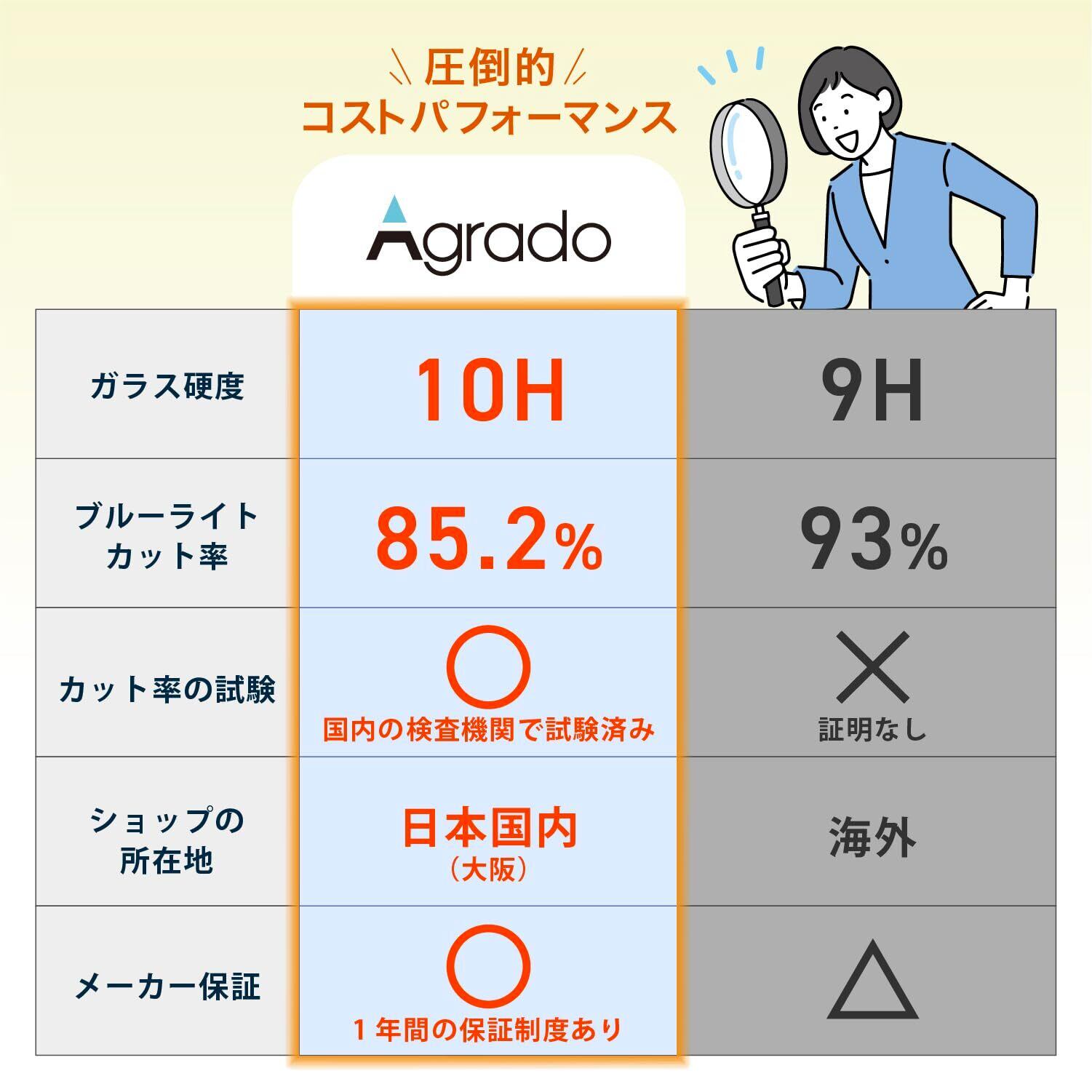 【 目にやさしいブルーライトカット仕様 】 日本製の強化ガラス(旭硝子製)を採用し、硬度10Hの高い耐久性に加えて、ブルーライトカット機能をプラス。UV(200~380nm)は98%カット、ブルーライトの中でも特に目への影響が大きい380~410nmは85.2%、全体(380~500nm)でも26.4%をカットします。
