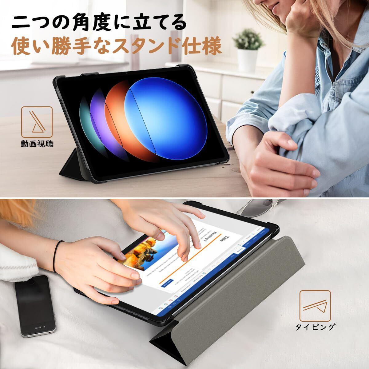 「便利なスタンド仕様」 フラップ部分には折り目が2ヶ所設けられており、折り曲がると手軽にスタンドに立てかける仕様より、タイピングや動画視聴などの2つの角度をご必要に応じてに使い分けられて、両手解放で動画鑑賞を楽々に楽しめ、仕事やゲームなどにもより快適に進められます。