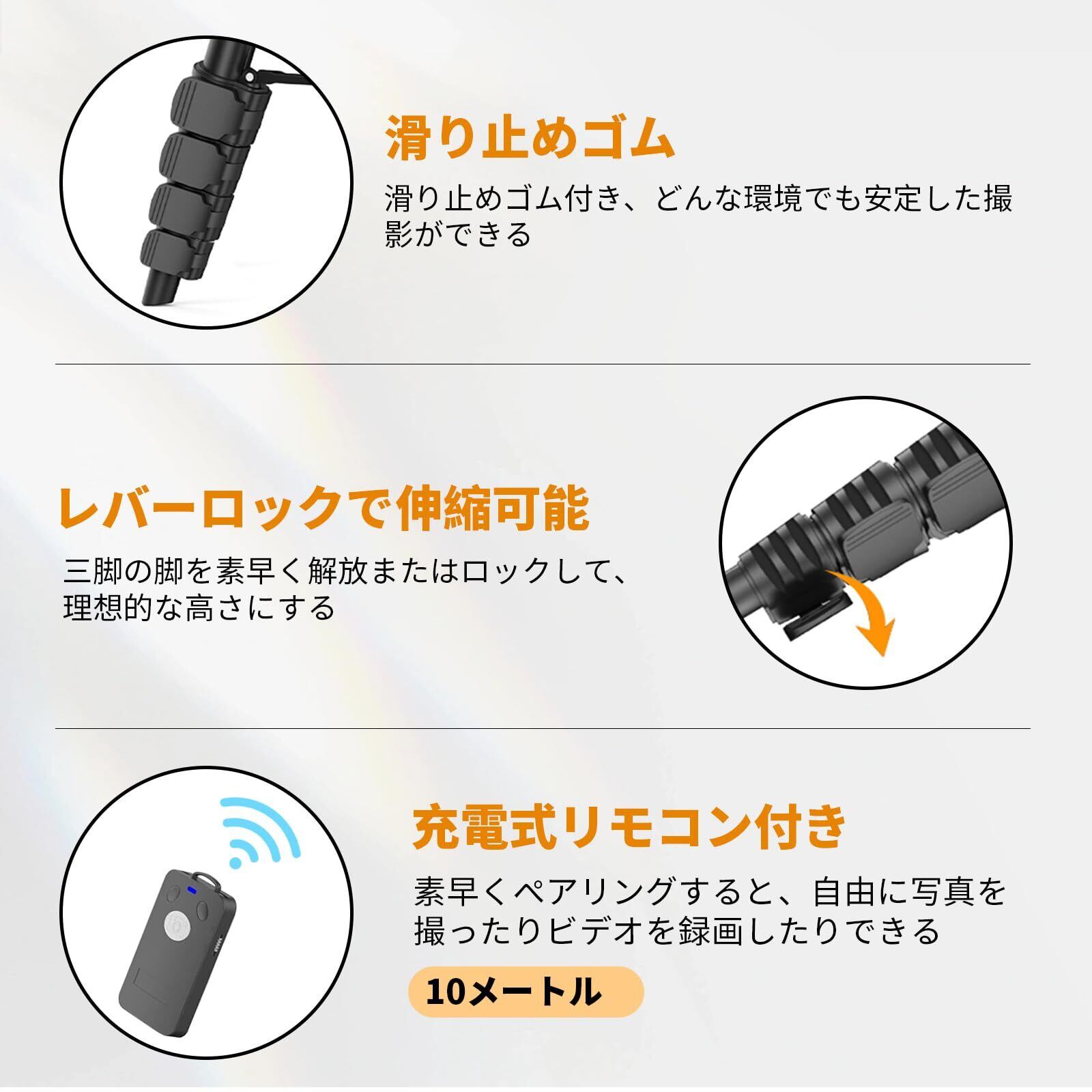 優れた安定性 手ブレ防止:脚に滑り止めゴム素材を採用し、ずれなどがありません。レバー式で、簡単な操作性という点もおすすめです。更に20mmのパイプ径を加えて不安定な岩場、起伏のある地面などの環境でも安定した撮影と動画撮影をできます。