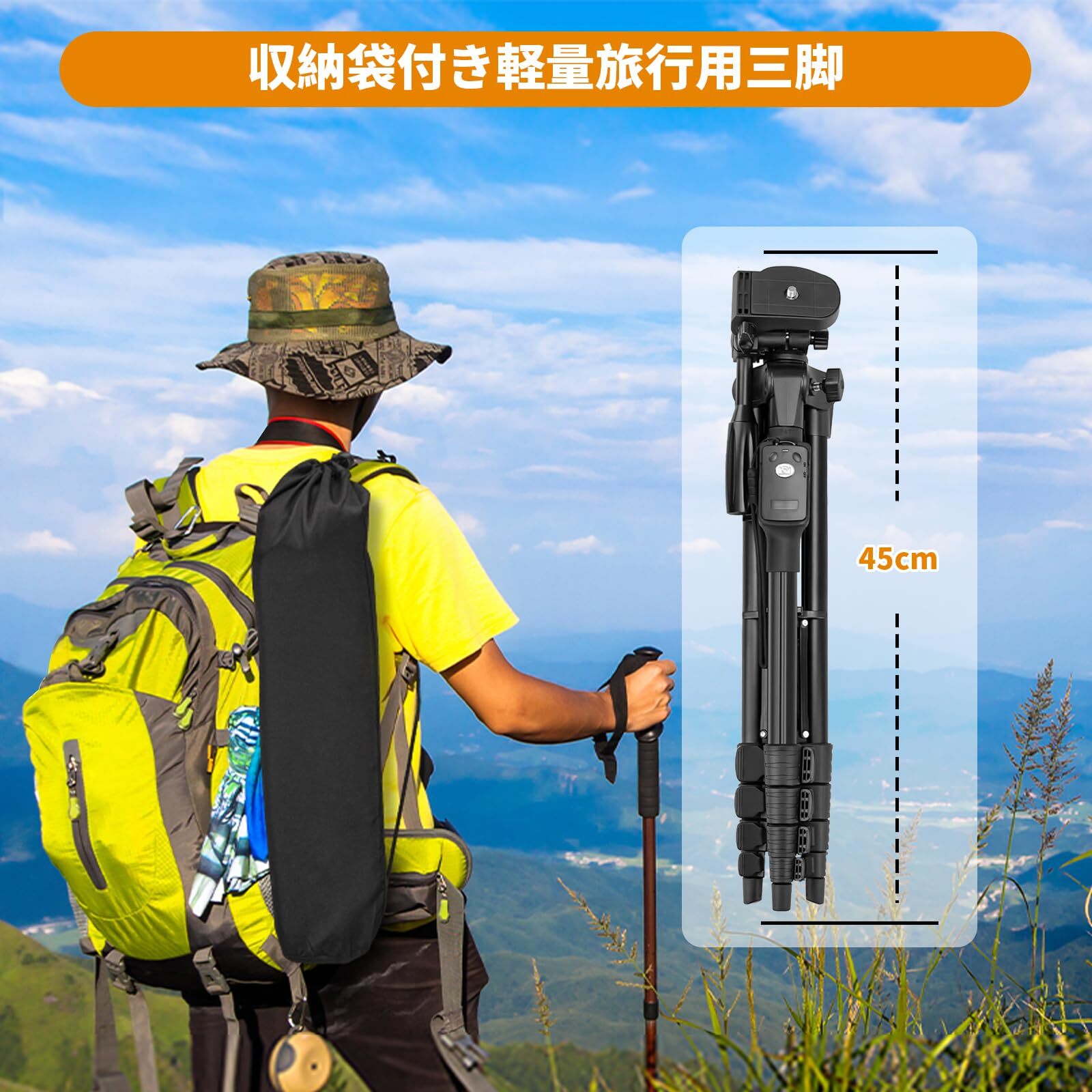 軽量&6段階調整:アルミニウム合金製で、頑丈の上に重量はたった0.8kg。高さは45cmから170cmの高い位置まで5段階調整できます。