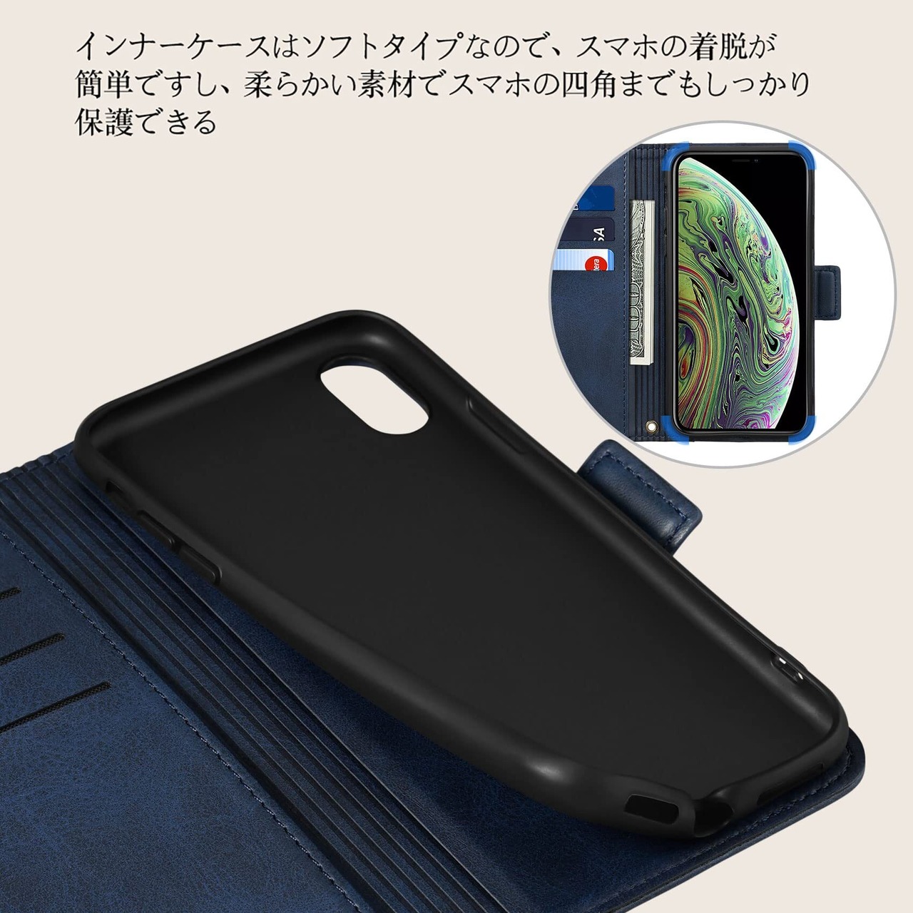 二重保護 外部のカバーは上質な合皮レザー素材を採用しており、放熱性や耐衝撃が良く、傷や埃を防ぐことができるiPhoneX、Xsカバーです。インナーケースは弾力性のあるソフト素材を採用しており、角までしっかり保護できるiPhoneX、Xsケースです。