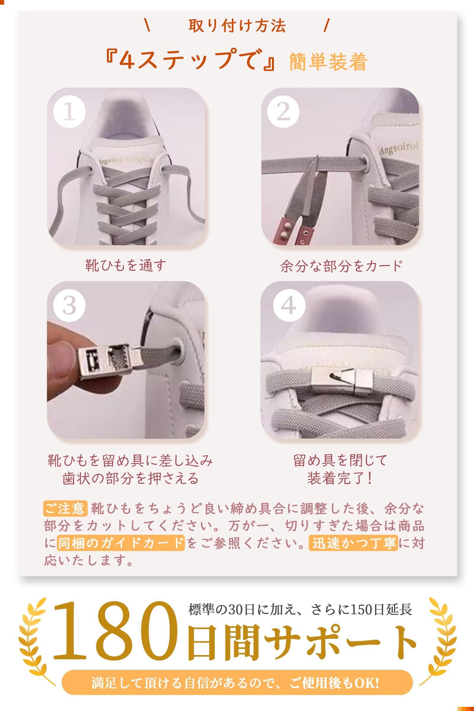 この結ばない靴ひもは、結ぶ必要がなく、伸縮性のあるゴム素材で簡単に脱ぎ履きが可能です。雨の日や急いでいる時でも、靴ひもがほどける心配がありません。2024年新登場の押しボタン式バックルを採用し、従来品のネジ式留め具に比べて取り付けが簡単です。4ステップで装着が完了し、靴ひものねじれを防ぎ、美しい見た目を保ちます。8mm幅の平ひもには8本のゴムが内蔵されており、耐久性が高く引っ張りにも強い仕様です。金属製のバックルを使用しているため、激しい運動でも外れにくく、安心です。また、靴ひもの長さは約100cmで、穴が14個以下の靴に対応可能。弾力性があるため、必要に応じて長さを調整でき、短い靴ひもや子供用の靴にも対応します。スニーカー、ブーツ、ドレスシューズなどあらゆる種類の靴に対応可能な全18色のバリエーションから選べ、バックルと靴ひもが同色で、カラフルなひもを靴のアクセントカラーとして使うことで、オリジナルのコーディネートを楽しむことができます。