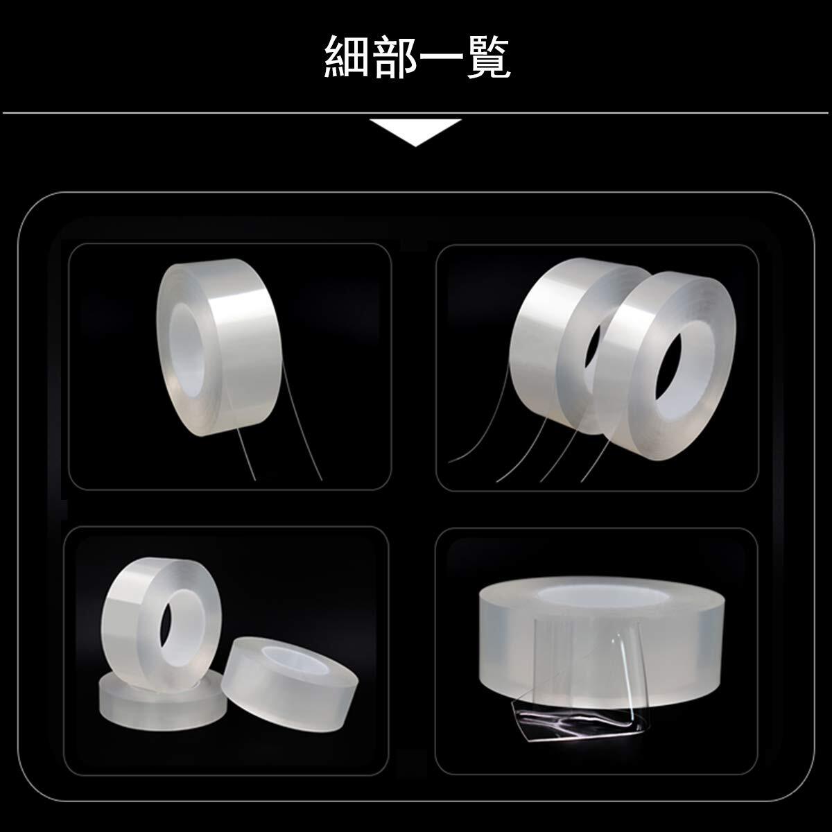 【製品仕様】種類:両面テープ。素材:アクリルゴム。色:透明。長さ:1m / 3m / 5m。幅:3cm / 5cm。厚さ:2mm。適用場所:日常家庭用、オフィス、寮、家電製品の足固定「地震対策」、コマーシャル看板の固定、カーペットの滑り止め、小物収納や置物固定などです。パッケージ:魔法両面テープx1。