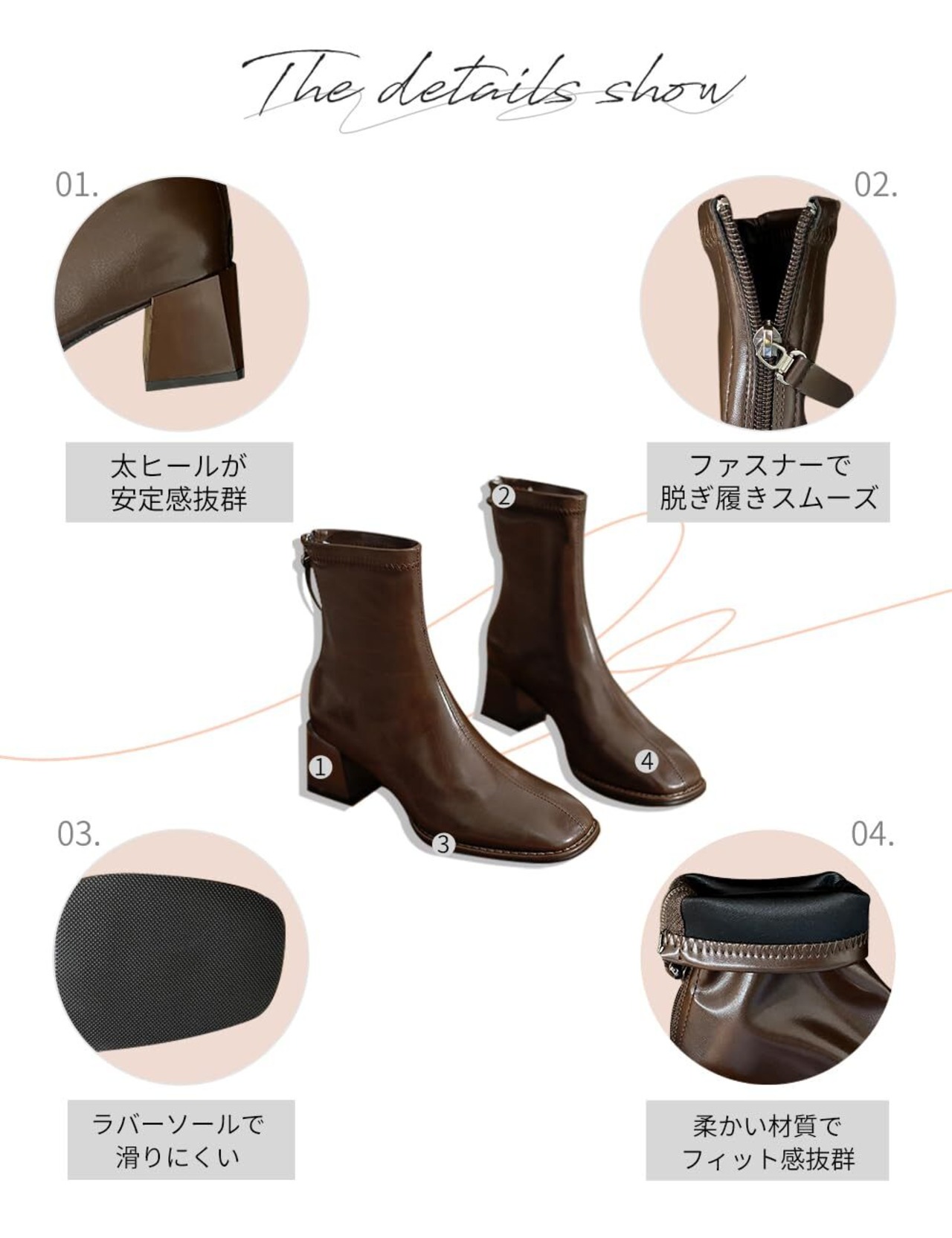 [Minax] ブーツ ショート レディース 太ヒール 歩きやすい 撥水 女性 秋 冬用 軽量 美脚 スクエアトゥ ステッチデザイン ストレッチ 柔らかい バックジップ 黒 白 茶 ブラウン 22.5cm-25.0cm