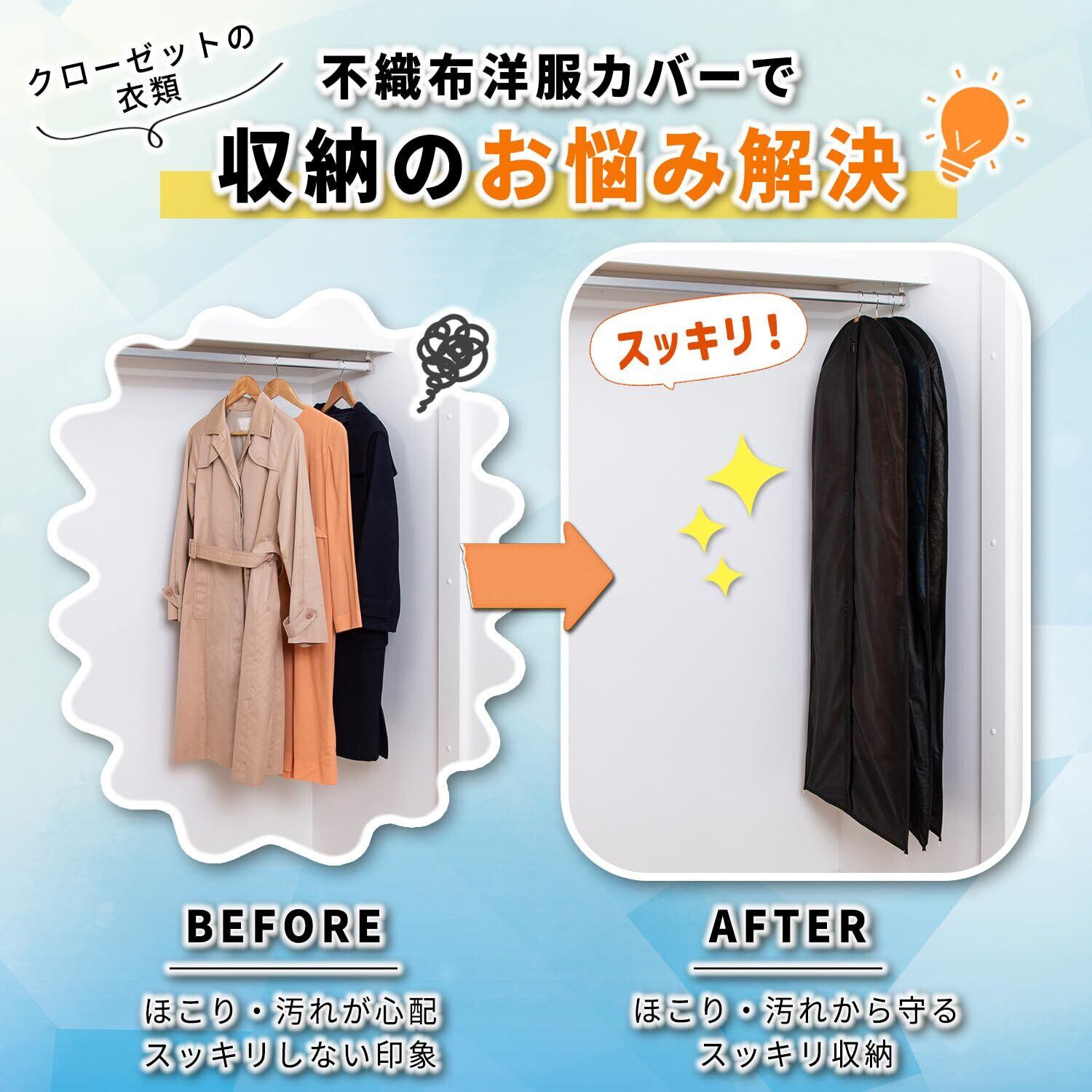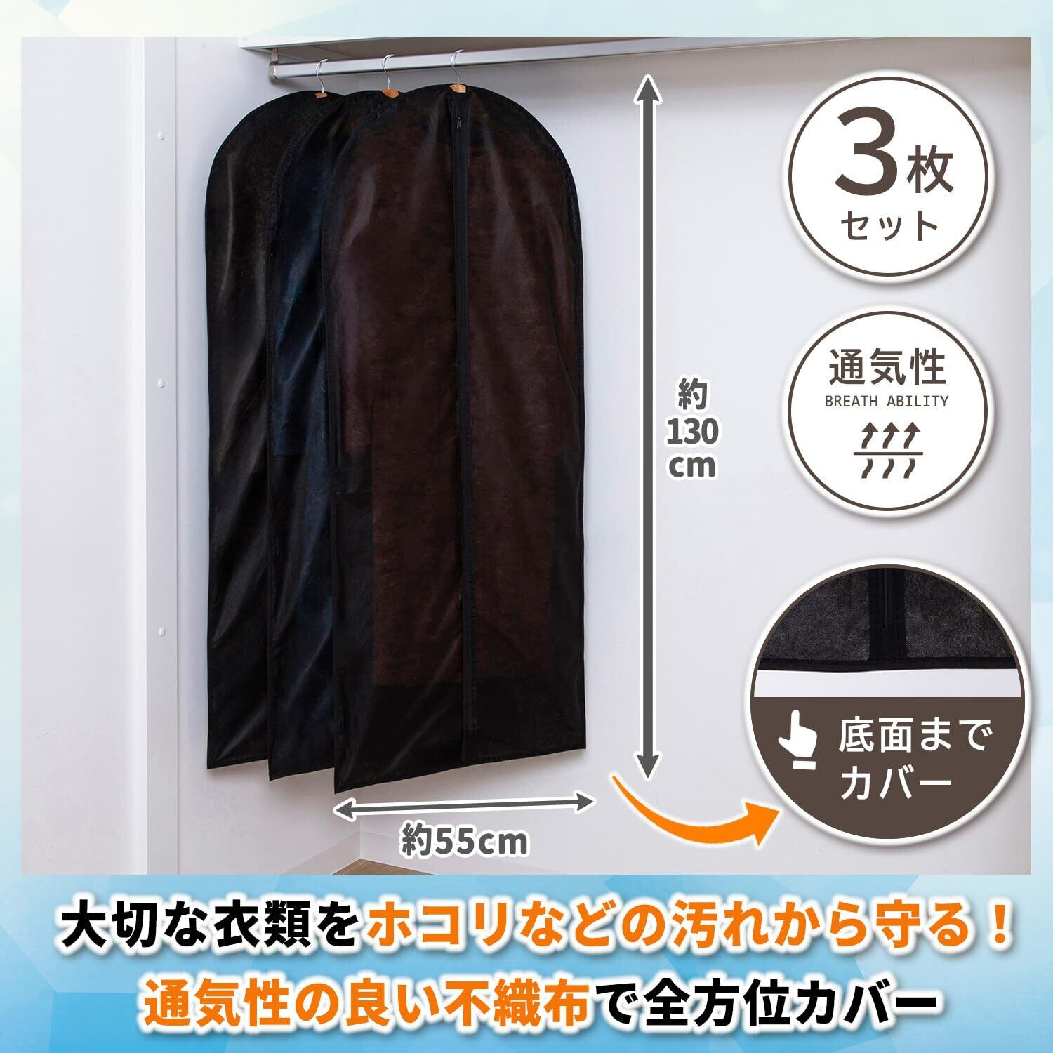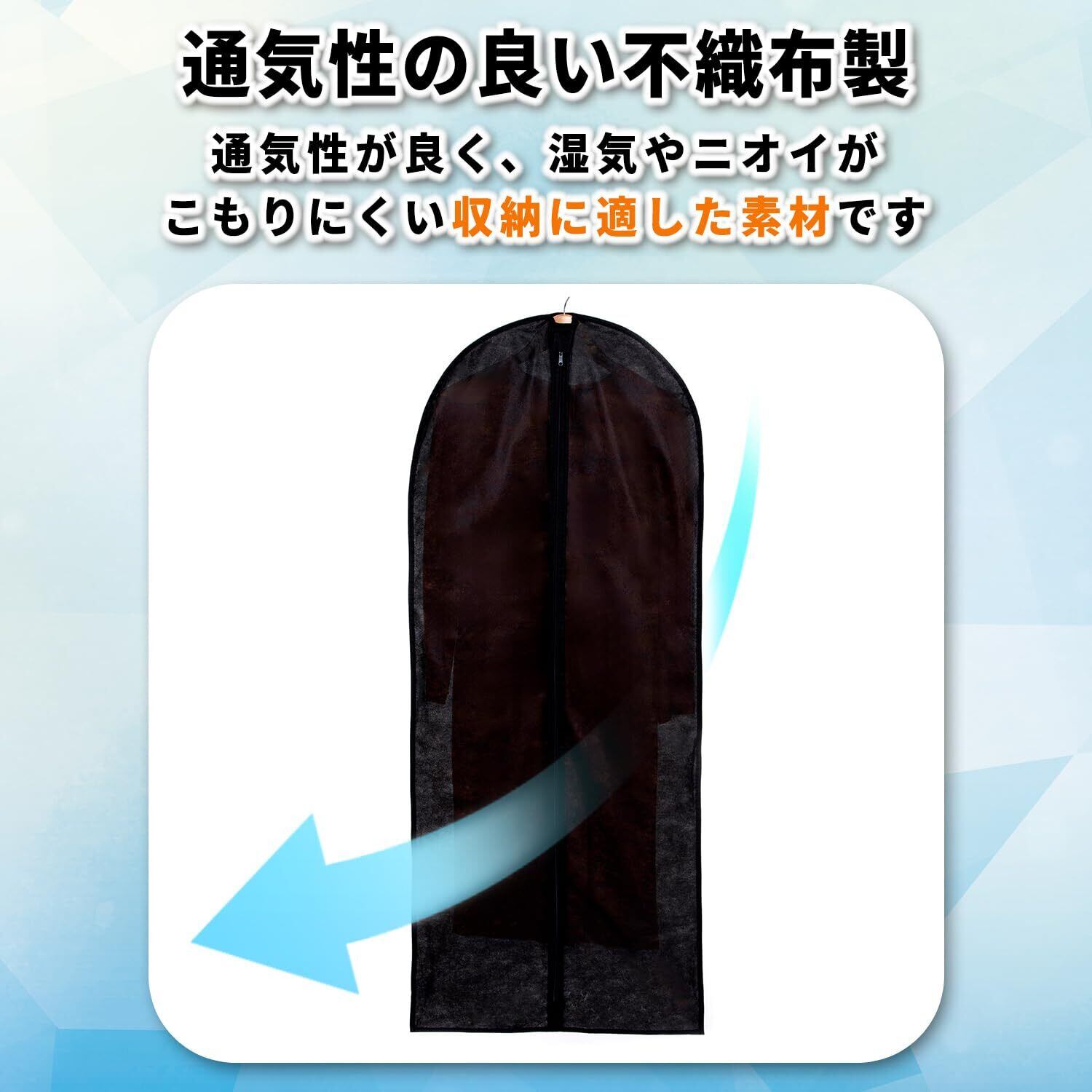 【通気性の良い不織布製の衣類カバー】:通気性が良く湿気やにおいのこもりにくい不織布製の衣類カバー。