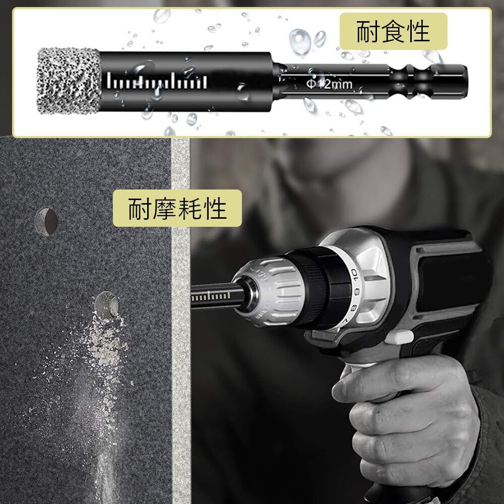 内容:直径範囲は6mm/8mm/10mm/12mmで、4つのドライドリルビットが含まれています。これらのビットは、大理石やガラス、陶器など、さまざまなタイルを効率的に切断するために設計されています。