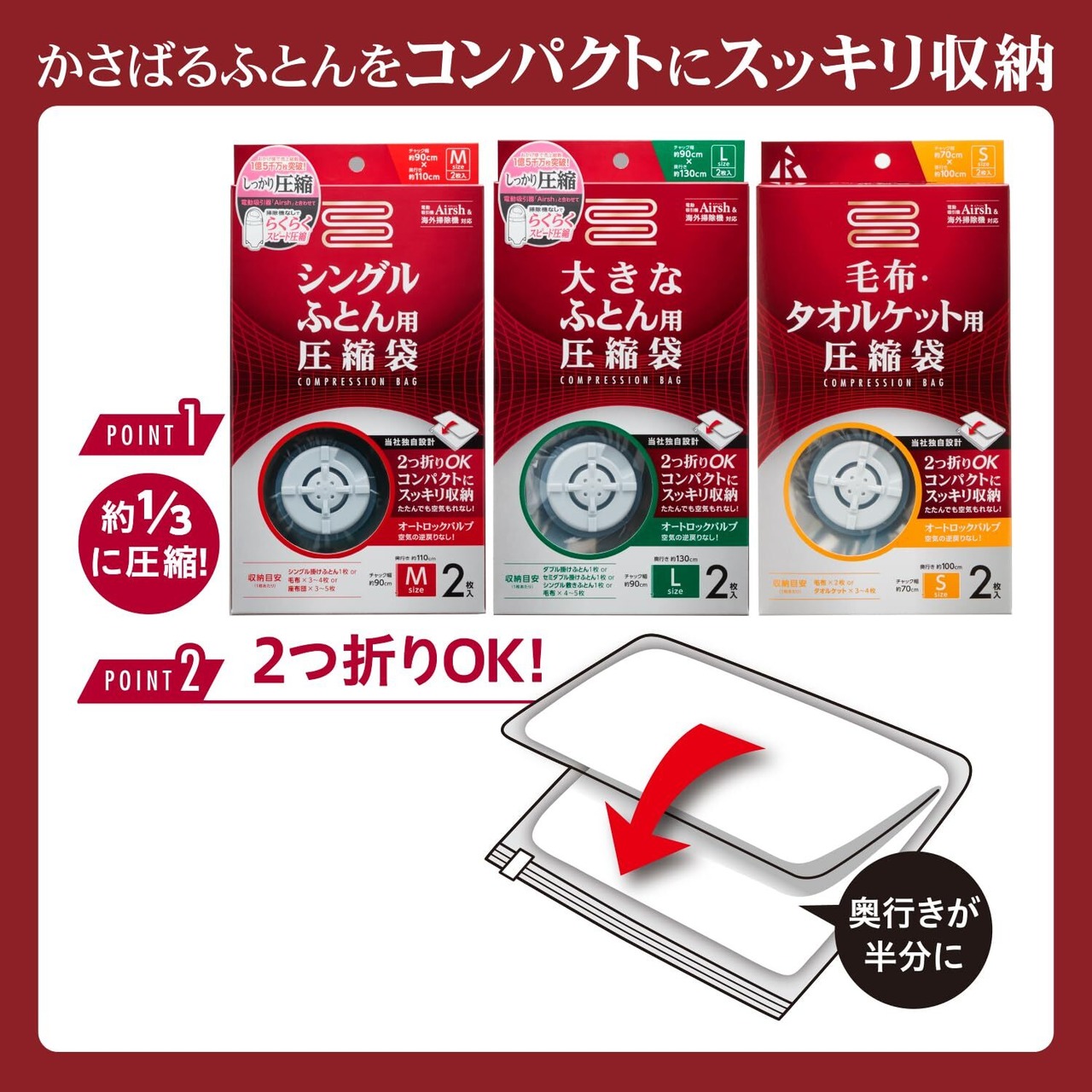 ・電動吸引機(エアッシュ)&海外掃除機対応・オートロックバルブなので、ノズルをあてるだけで簡単に圧縮でき空気の逆戻りがありません。・2つ折りOK、さらにコンパクトに収納できます。
