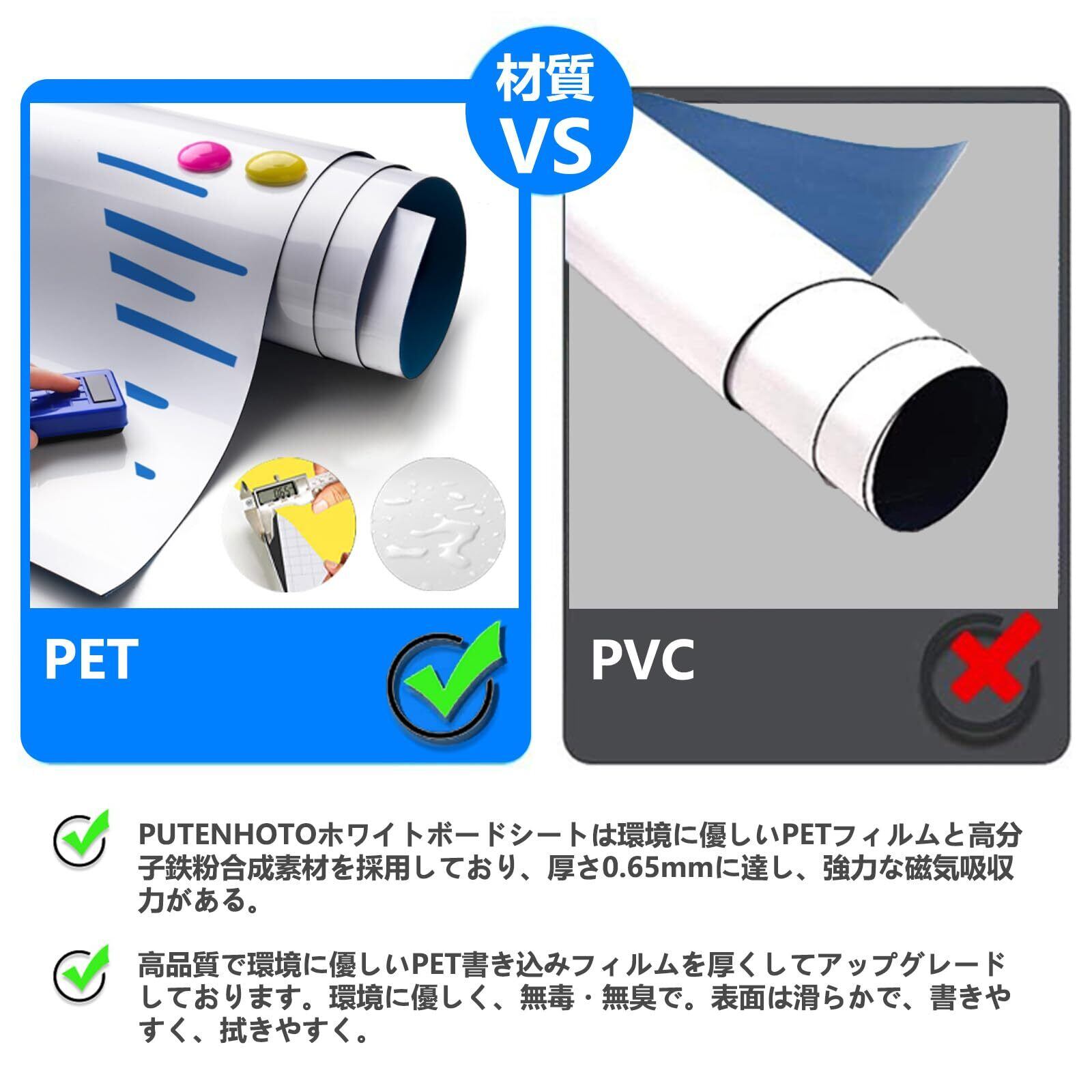 【磁気吸着力は約A4紙5枚です】Putenahoto ホワイトボードシートの厚さは0.65mmに達して、高分子鉄粉を豊富に含んでいて、磁性が強くて、磁性が弱まることがありません。 注意: 磁気と書く機能を守るため、ご使用前に、保護フィルムを剝がしてください。