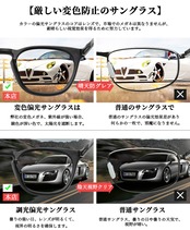 【ご注意】調光レンズとは太陽光の紫外線の強弱によって変色しますので、社内、室内、曇り空など紫外線の弱いでは変色調光が弱くなることを予めご了承ください。調光効果につきましては付属の紫外線照射灯(ブルーライト)とテストカードにてご確認ください。