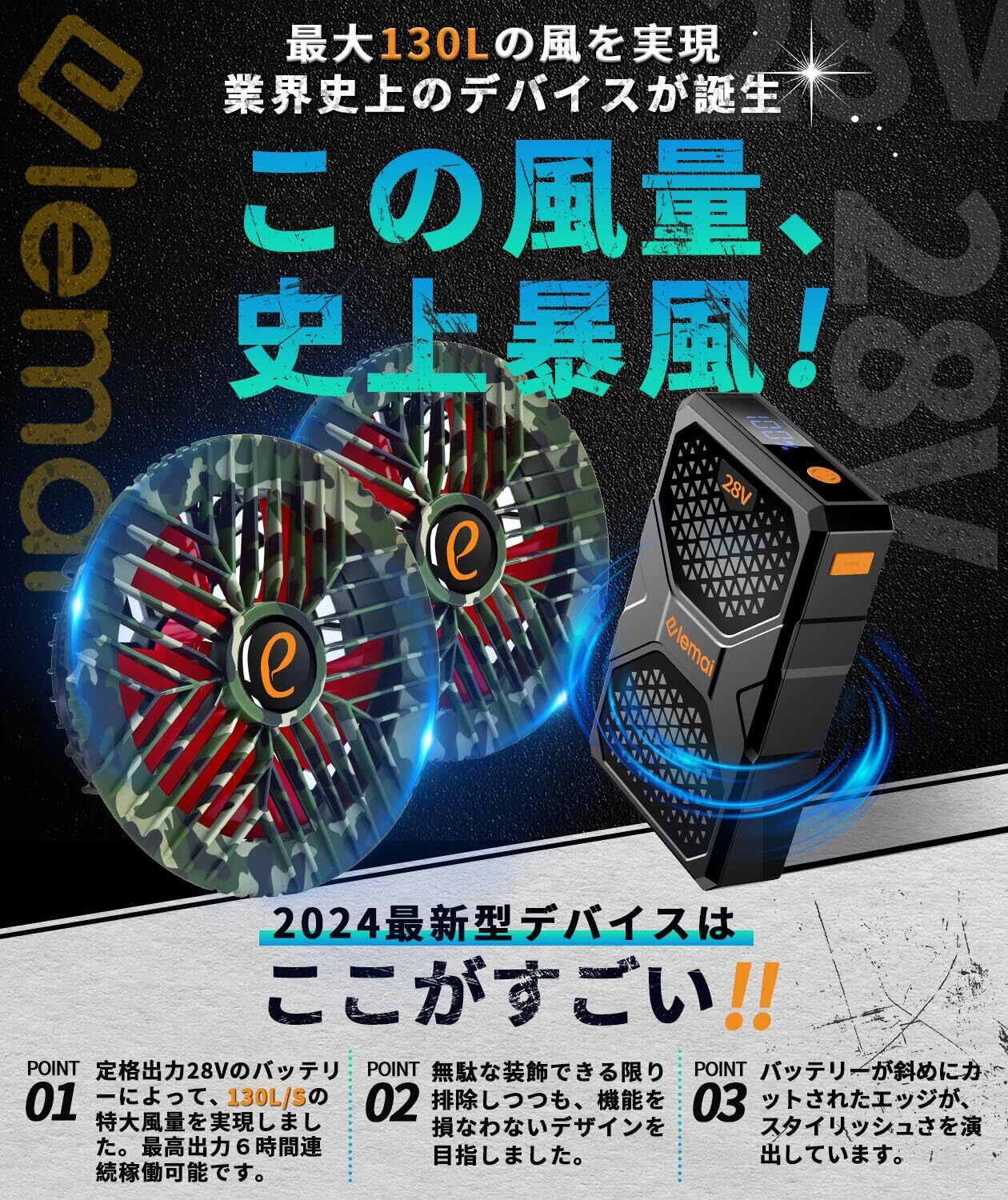 [elemai] フアン付き作業服対応 30000mAh 業界超高電圧出力28Vファンバッテリー セット 猛暑対策 ファン防塵カバー付き 2024年モデル 多色バリエーション