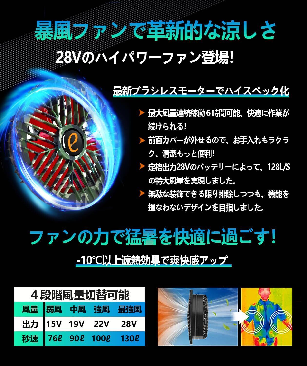 【猛暑対策の必須アイテム!】「elemai」のフアン付き作業服は、28Vの超高電圧出力を誇る30000mAhバッテリーを搭載した、業界初の革新的商品です。高いパフォーマンスを発揮し、猛暑日でも快適に作業ができる環境を作り出します。ファン防塵カバー付きで、安心して使用可能な設計が魅力です!