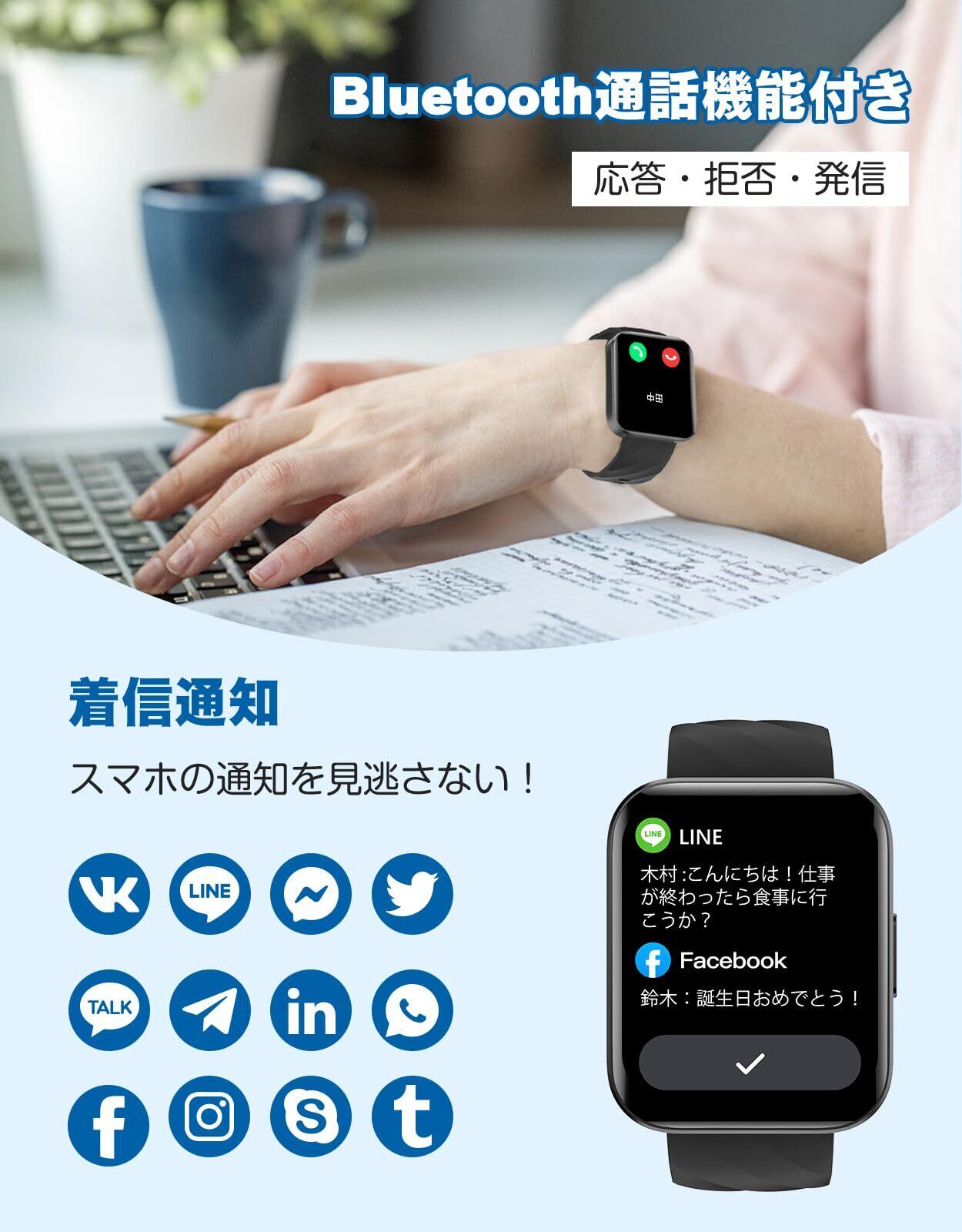 【大容量バッテリー&便利な機能満載】長い持ちのバッテリー搭載され、一回フル充電、3~5日間の連続使用も問題なく、待機時間は約30日間です。頻繁に充電する手間が省けます。付属の磁気充電ケーブルをスマートウォッチの充電端子に接続すると充電開始となります(実際の使用状況や環境によって電量持ち時間が異なります)通知やBluebooth通話などの基本的なスマートウォッチ機能に加え、例えば、音声アシスタント、おやすみモード、携帯検索、天気予報、懐中電灯、電卓、ゲーム、目覚まし時計、ストップウォッチ、SOSなど、日常生活をより快適にする機能が搭載されています。また遠隔操作もお任せください。ios9.0以上、android5.0以上のスマホに対応可能、さまざまシーンで使用できます!レディースでも、メンズでも、幅広い方にお使いいただけます。敬老の日、誕生日、父の日、母の日、新年、 クリスマスなどに適用なプレゼントとなります。