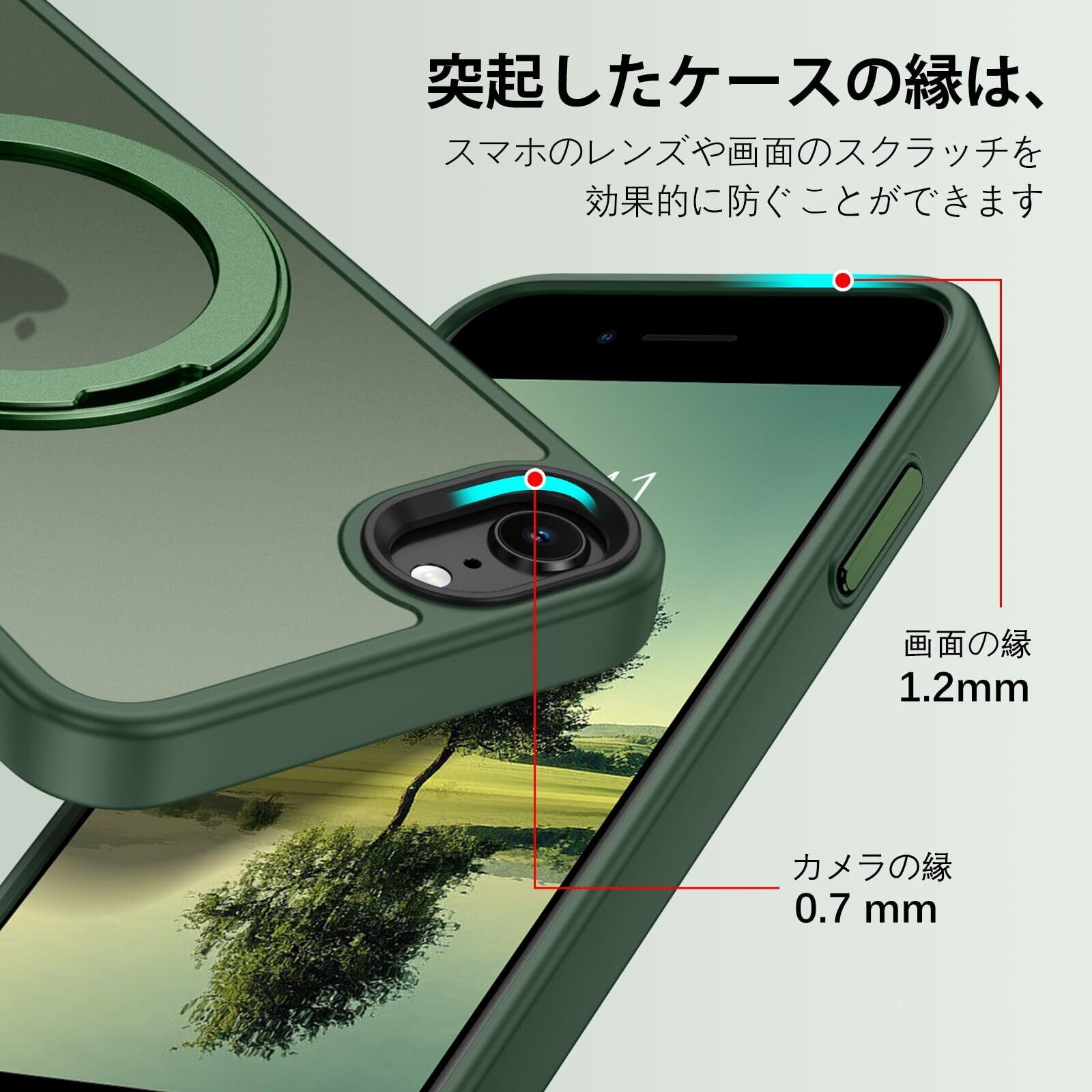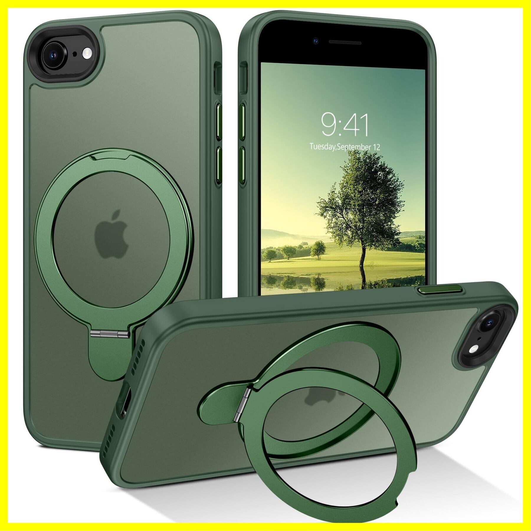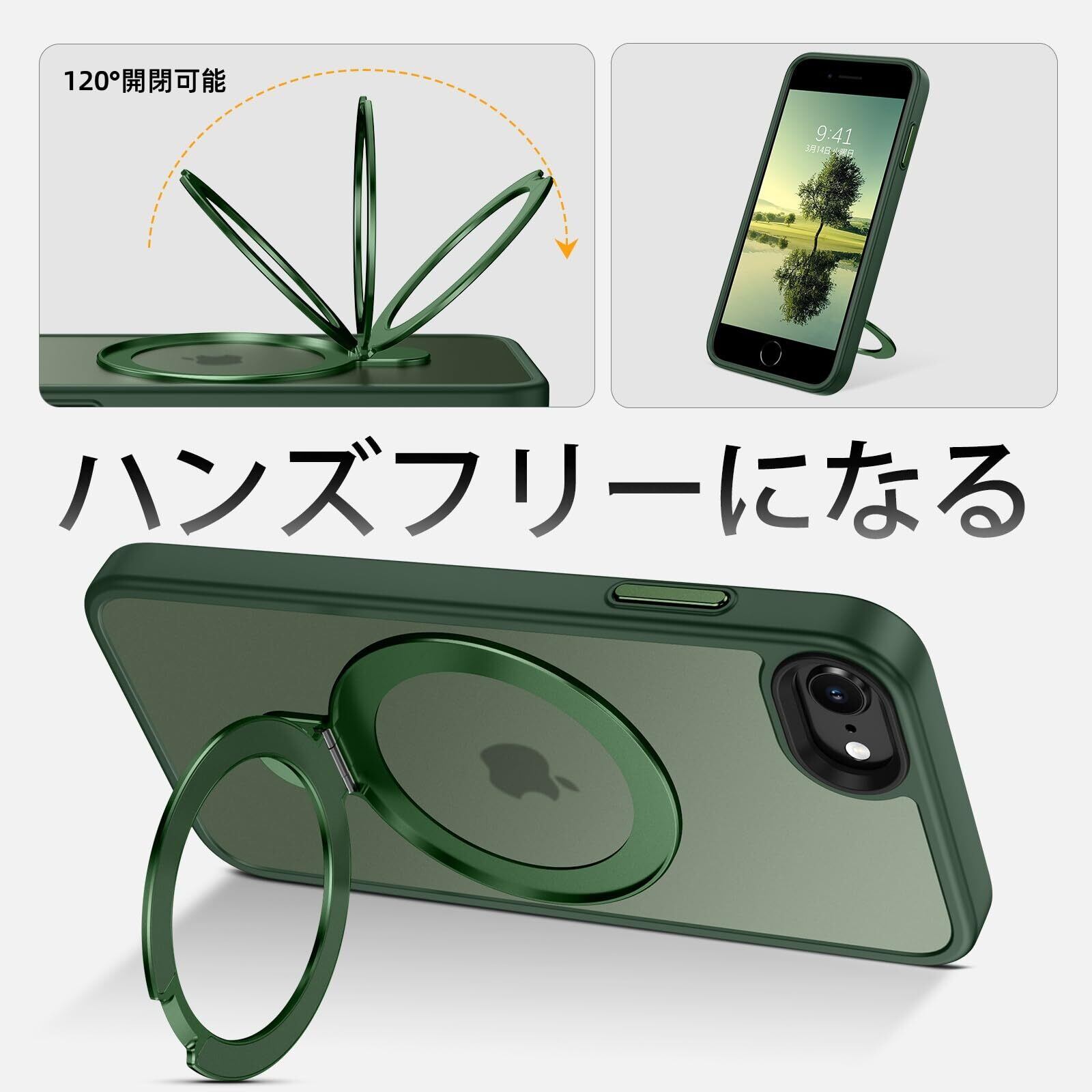 DUEDUE iPhone SE ケース 第2世代 第3世代 MagSafe対応 iPhone8/7 ケース マグネット搭載 リングスタンド機能 120°開閉可能 グリーン 半透明デザイン 指紋防止 耐衝撃 一体型 薄型 TPUケース 車載ホルダー対応 ワイヤレス充電 全面保護