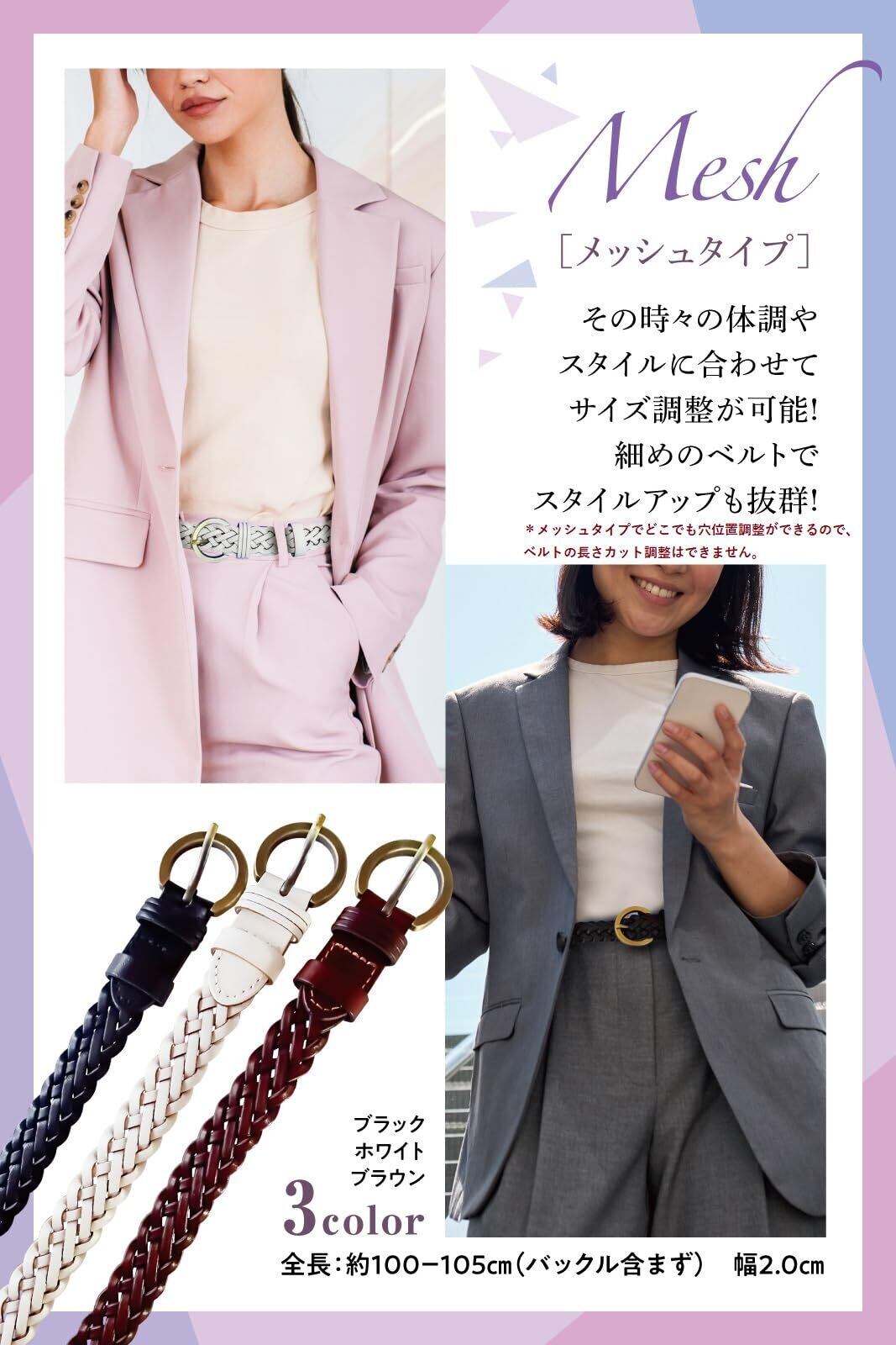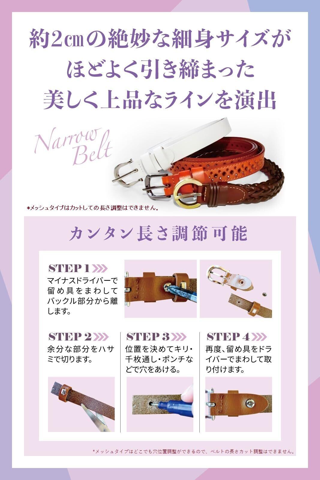 レディース細めのベルト。幅広い年齢層でご使用頂けるシンプルで飽きの来ないデザイン。無地、柄、メッシュタイプの3種類。女性らしさを引き出す牛本革の本物志向のベルトです。ビジネス、就職活動、レジャー、ゴルフにも。フォーマル/カジュアルどちらでも使えます。