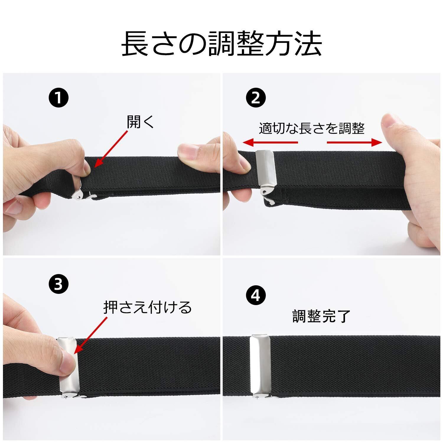 日常着にも、フォーマル、ビジネス、作業用の場合にもぴったりです。また、彼氏、友人とお父さんへのプレゼントとしておすすめです。ご使用上のご注意:1.サスペンダーを装着する際は、クリップに過度の力が掛かる状態(ズボンを吊り上げる以上の力)でのご使用は避けてください。2.サスペンダーのクリップに厚手の生地などを挟んで無理やりクリップを閉じないで。3.ズボンとベルトを一緒に挟んだりしない。4.その他、サスペンダーやクリップに過度の力を加えての開閉しないようにご注意ください。