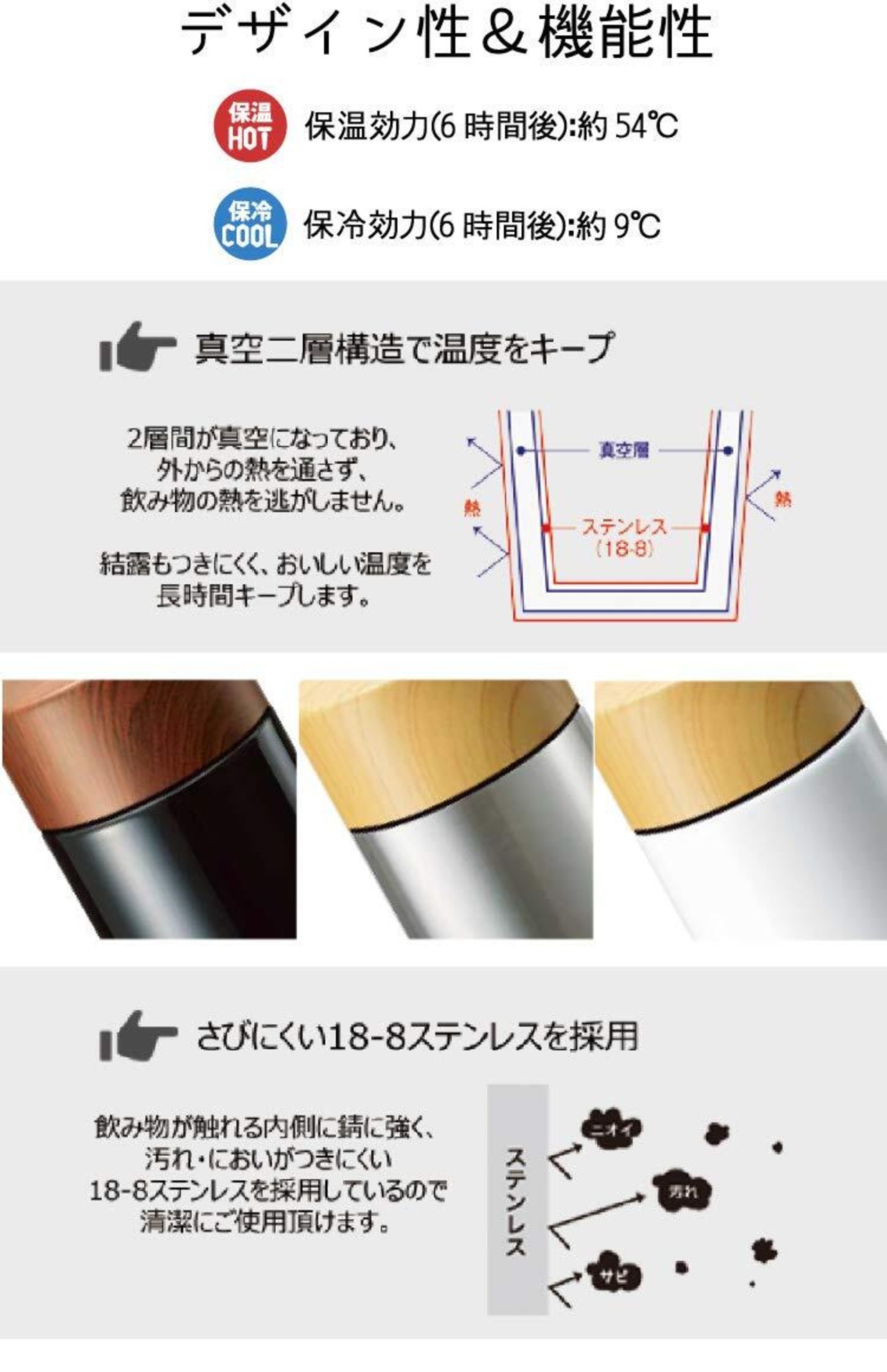 木目調のキャップがおしゃれなサーモボトルです。使うたびにホッと和む、ナチュラルな木目デザイン。一味違う風合で一歩リードしよう。特別感があるのでギフトにも喜ばれます。