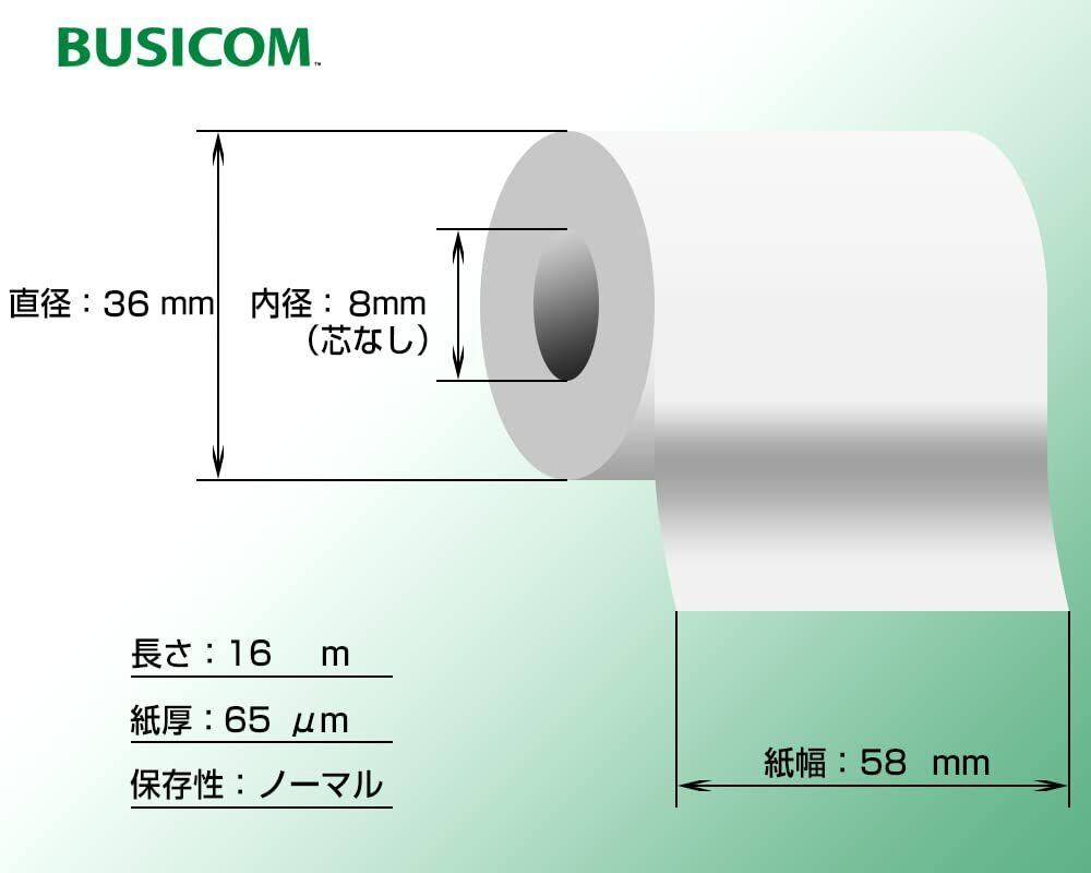 ロール紙サイズ:幅58mm×外径36mm×内径8mm (58×36×8) 芯無し