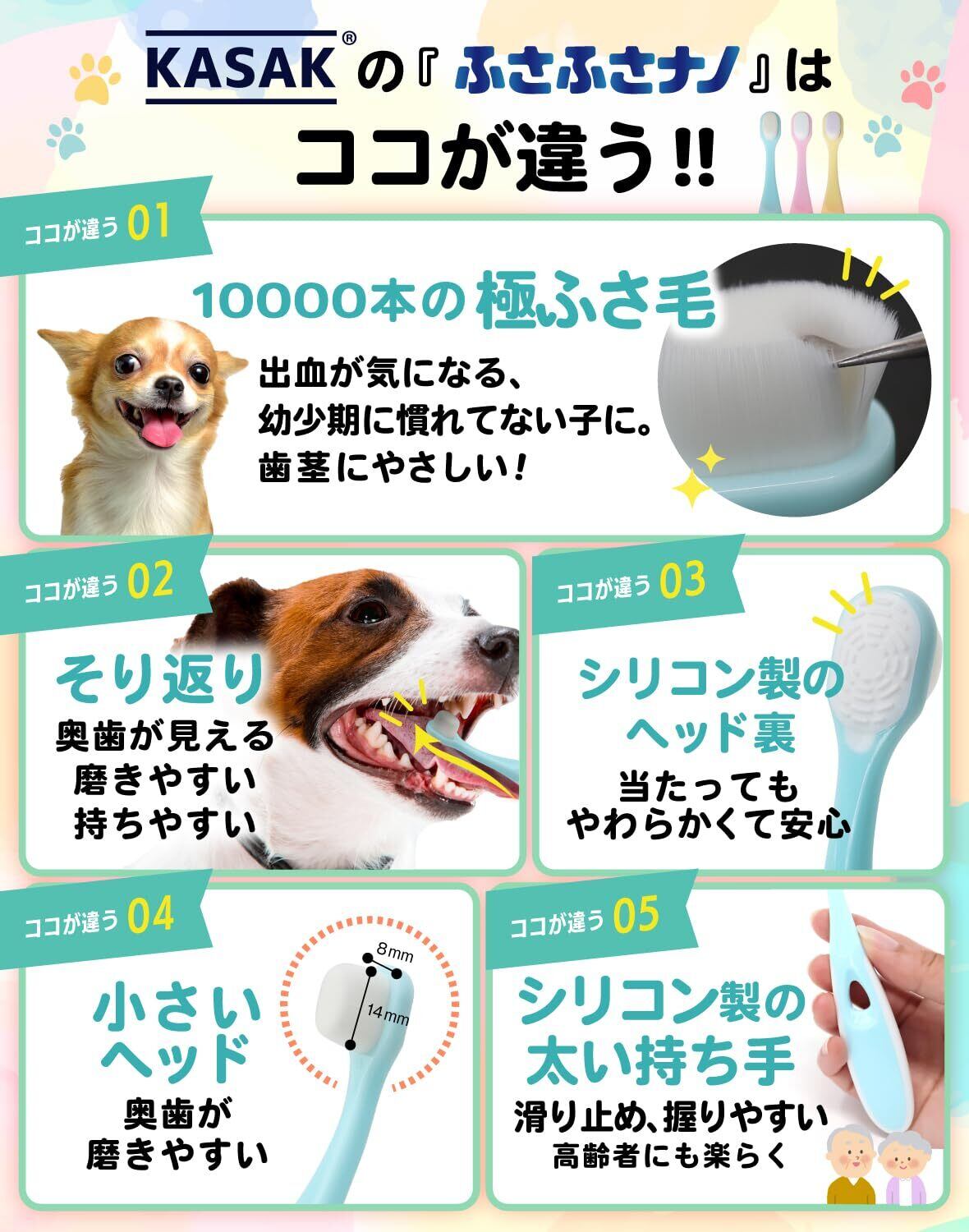 【獣医師監修】 犬用歯ブラシ 犬歯磨き 小型犬『ふさふさナノ』【10000本の超極細毛】【歯茎にやさしく出血しない】ペット/犬/歯磨き/歯石取り/3本セット(ブルー、ピンク、イエロー3色各1本) KASAK