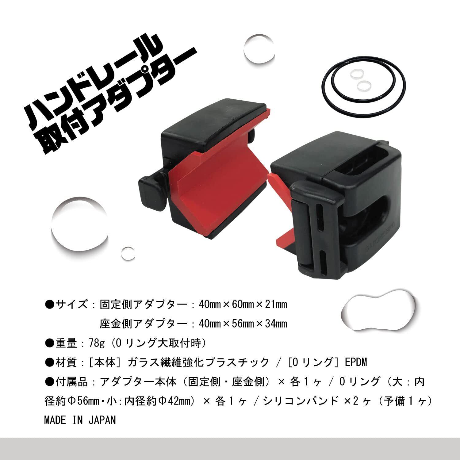 付属品:アダプター本体(固定側・座金側)×各1ヶ / Oリング(大:内径約Φ56mm・小:内径約Φ42mm)×各1ヶ /シリコンバンド×2ヶ(予備1ヶ)