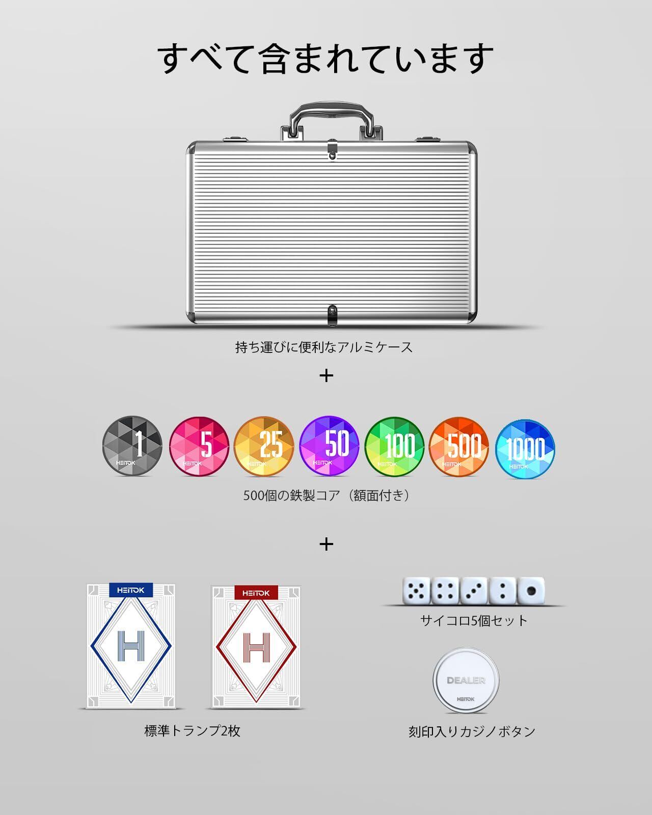 HEITOK ポーカーチップ ポーカーセット 500枚 数字入り 11.5g カジノチップ トランプ2組とサイコロ5個が付属 ABS製チップ アルミ製スーツケース入り