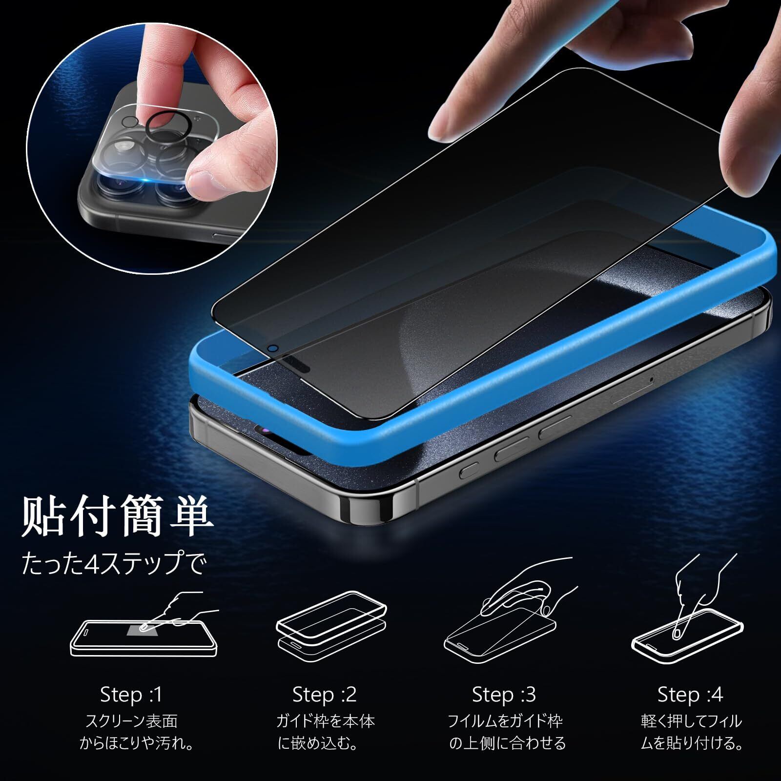 【ガイド枠付き・初心者でも簡単に貼れる】 ガイド枠を装着 → 上部に合わせてフィルムを置く → 軽く押すだけで自然に吸着。初めての方でも簡単に貼れるよう、専用の貼り付けガイド枠を同梱しています。iPhone 15 Pro用ガラスフィルムがズレることなく、誰でもきれいに貼り付けることができます。