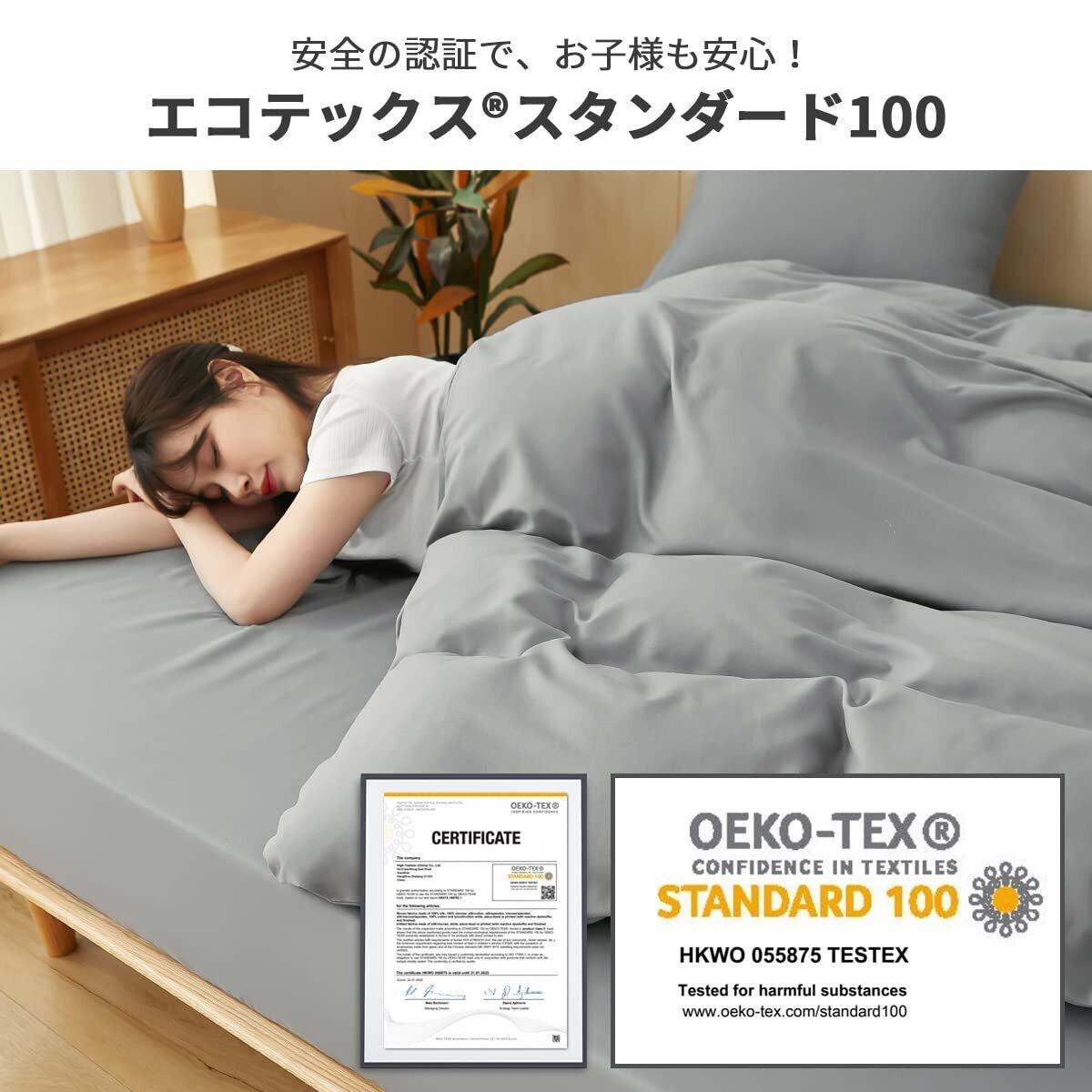 <安全の認証マーク>300種類以上の有害物質を対象にした、世界最高水準の安全な繊維製品であることを示す「エコテックススタンダード100」認証を取得。保育園布団カバーとしても安心して使用できます。