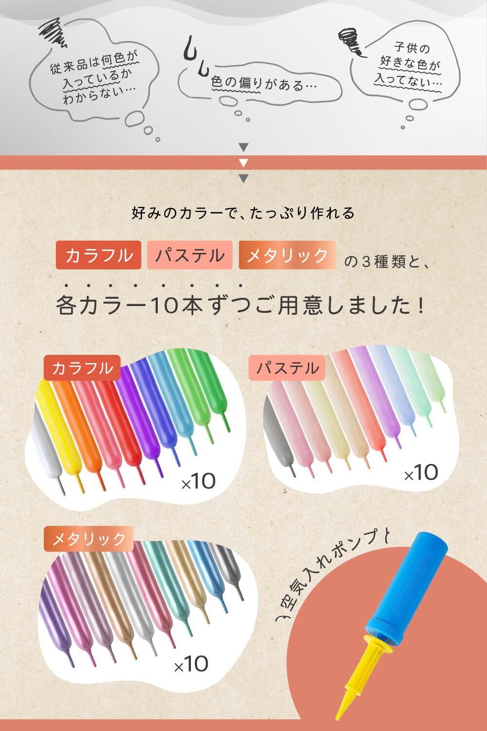 【カラバリ豊富で選べるバルーンアート風船】バルーンアート初心者でも簡単!親子で楽しめる^^従来のバルーンセットには「どんな色が入っているかわからない」「色に偏りがある」といった声がありました。そんなお客様の声にお応えし、当社のバルーンアート風船はカラフル・パステル・メタリックの3つのバリエーションをご用意!それぞれ10色×10本ずつの計100本入りでお届けするため、必要な色味を自由に選べます。お子さまのイベントや装飾にぴったりなバルーンセットです 【お子さまと一緒に楽しめる!丈夫で扱いやすい高品質バルーン】 割れにくく丈夫な素材を採用しているので、小さなお子さまと一緒に安心してバルーンアートを楽しめます!初心者でも使いやすい設計で、バルーンアートの扱い方や動物や花などの作り方を解説した動画付きWEBマニュアルをご用意。初めての方でも手順を確認しながら楽しく挑戦できるので、親子で特別な時間をお過ごしいただけます 【カラーバリエーションの魅力】カラフル:ビビッドで色鮮やかな原色カラーは、イベントや装飾に映えること間違いなし!明るくポップな演出をしたい場面にぴったりです。 パステル:子どもから大人まで人気のパステルカラーは、何を作っても可愛く仕上がる万能カラー温かみがあり、やわらかい印象を演出できます。 メタリック:光沢感が特徴のメタリックカラーは、高級感あふれるエレガントなパーティーや特別な場面に最適。目を引く演出で、場を華やかに彩ります! 【多様なシーンで活躍】バルーンアートの動物や花、文字など、自由に作れるアイテムとして誕生日パーティー、結婚式、学校イベント、店舗装飾など、あらゆるシーンを彩ります。選べる3つのバリエーションで、イベントのテーマや雰囲気にぴったりの色味を演出できます。 【カラバリ豊富で選べるバルーンアート風船】バルーンアート初心者でも簡単!親子で楽しめる^^従来のバルーンセットには「どんな色が入っているかわからない」「色に偏りがある」といった声がありました。そんなお客様の声にお応えし、当社のバルーンアート風船はカラフル・パステル・メタリックの3つのバリエーションをご用意!それぞれ10色×10本ずつの計100本入りでお届けするため、必要な色味を自由に選べます。お子さまのイベントや装飾にぴったりなバルーンセットです 【お子さまと一緒に楽しめる!丈夫で扱いやすい高品質バルーン】 割れにくく丈夫な素材を採用しているので、小さなお子さまと一緒に安心してバルーンアートを楽しめます!初心者でも使いやすい設計で、バルーンアートの扱い方や動物や花などの作り方を解説した動画付きWEBマニュアルをご用意。初めての方でも手順を確認しながら楽しく挑戦できるので、親子で特別な時間をお過ごしいただけます 【カラーバリエーションの魅力】カラフル:ビビッドで色鮮やかな原色カラーは、イベントや装飾に映えること間違いなし!明るくポップな演出をしたい場面にぴったりです。 パステル:子どもから大人まで人気のパステルカラーは、何を作っても可愛く仕上がる万能カラー温かみがあり、やわらかい印象を演出できます。 メタリック:光沢感が特徴のメタリックカラーは、高級感あふれるエレガントなパーティーや特別な場面に最適。目を引く演出で、場を華やかに彩ります! 【多様なシーンで活躍】バルーンアートの動物や花、文字など、自由に作れるアイテムとして誕生日パーティー、結婚式、学校イベント、店舗装飾など、あらゆるシーンを彩ります。選べる3つのバリエーションで、イベントのテーマや雰囲気にぴったりの色味を演出できます。