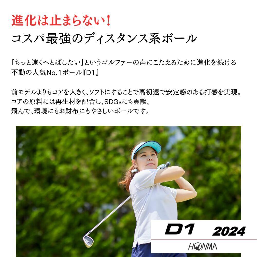 飛んで、環境にもお財布にもやさしい。本間のD1ゴルフボールは、プレーヤーの期待に応える高品質な3箱セットです。「もっと遠くへとばしたい」というゴルファーの声にこたえるために進化を続ける不動の人気No.1ボール『D1』。前モデルよりもコアを大きく、ソフトにすることで高初速で安定感のある打感を実現。コアの原料には再生材を配合し、SDGsにも貢献。飛んで、環境にもお財布にもやさしいボールです。3箱セットなので、プレー頻度の高いゴルファーにも安心の数量です。ゴルフを愛する方々の実力を引き出す、信頼のパートナーとしてお勧めです。進化は止まらない!コスパ最強のディスタンス系ボール!
