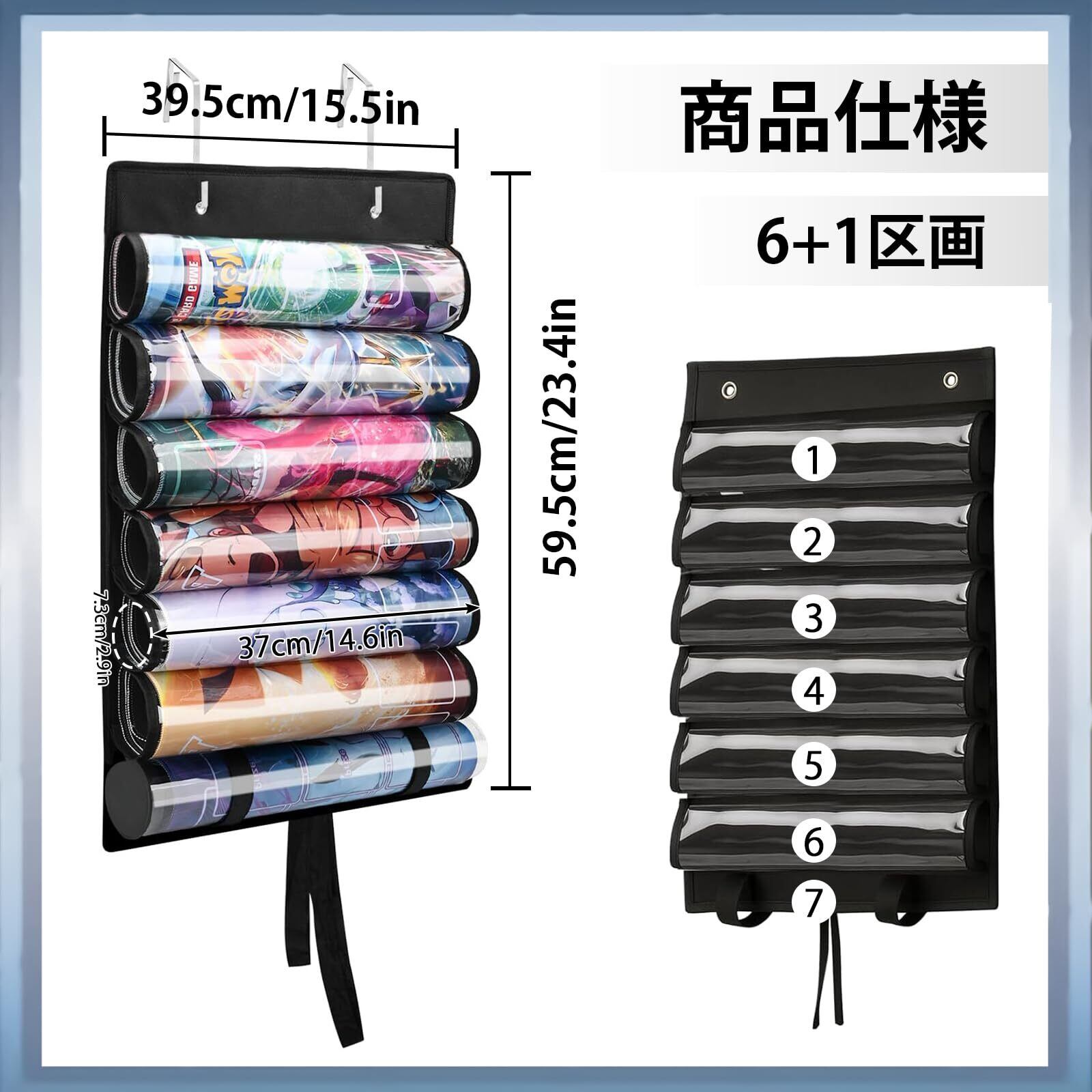 Namioka プレイマット収納 プレイマットホルダー MTG用プレイマットチューブ収納バッグ(フック2個付き) 透明プラスチックスロット付き、カードゲームプレイマット6枚+1枚収納可能。TCG/RPGマット用ポータブルオーガナイザーラック (6収納+1ポケット)