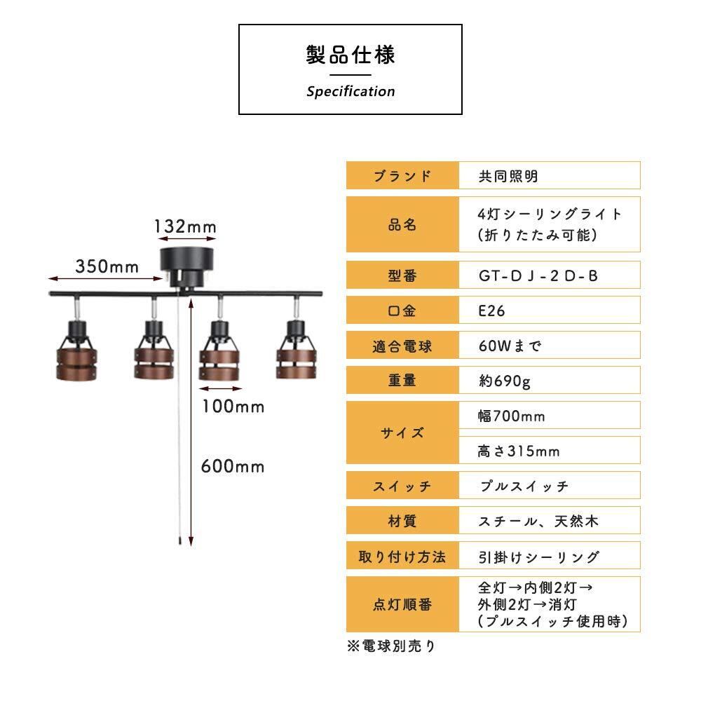 【プルスイッチ付属】:プルスイッチを引っ張ることで、点灯数を全灯→2灯→残り2灯→消灯の順番で切り替えることができます。壁スイッチのないお部屋にも利用できます。注意点:4灯のうち端2つあるいは両端のライトがつかない場合、プルスイッチを引っ張ることで調節可能。