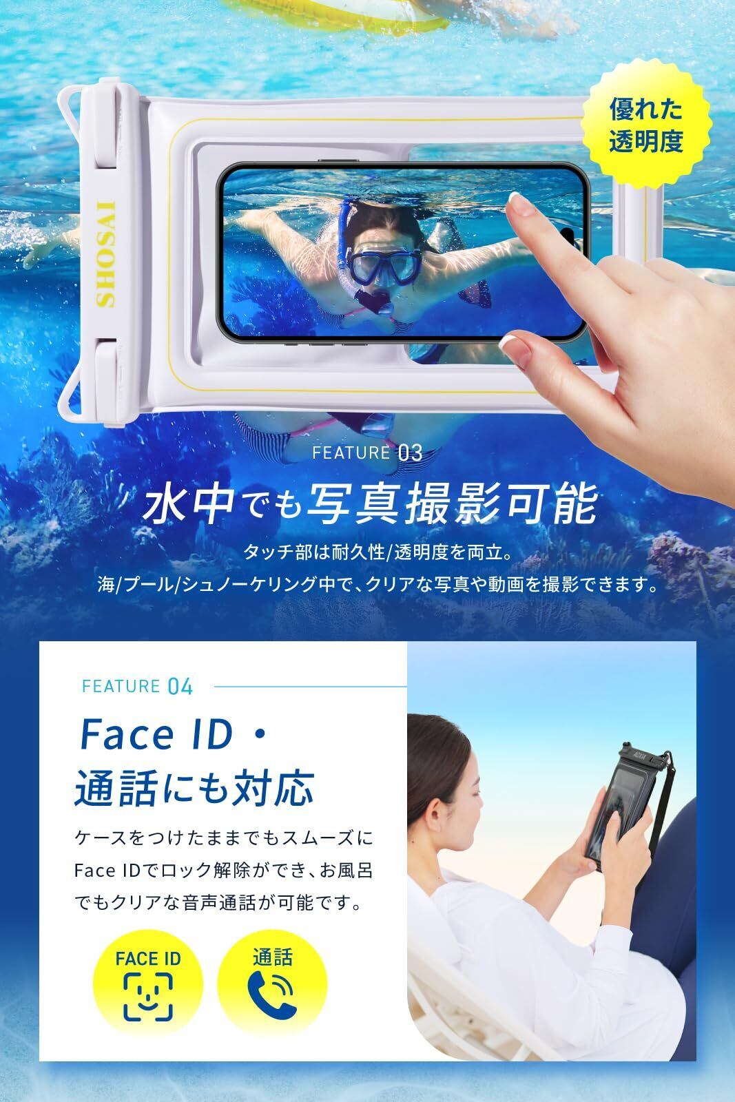 【 FACE ID や通話にも対応】 防水 スマホケース をつけたまま タッチ操作 や 通話 、 顔認証 が可能です。首掛け やショルダー 掛けに対応した ストラップ が付属しています。