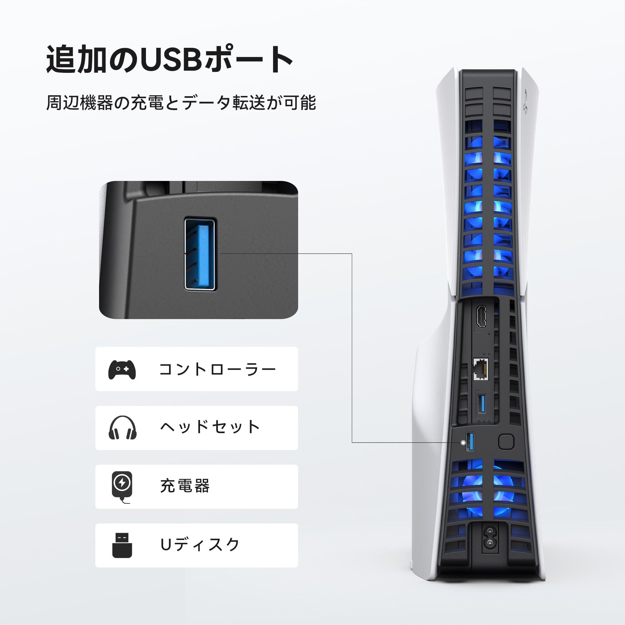 【USB 3.0 搭載】純正のps5用 冷却ファンは追加的なUSB 3.0 ポートが装備されており、新型PS5 slim 本体元の USB ポートを占有しなく、 コントローラー、ヘッドセット、U ディスクなどの ps5 周辺機器を接続できるようになります。