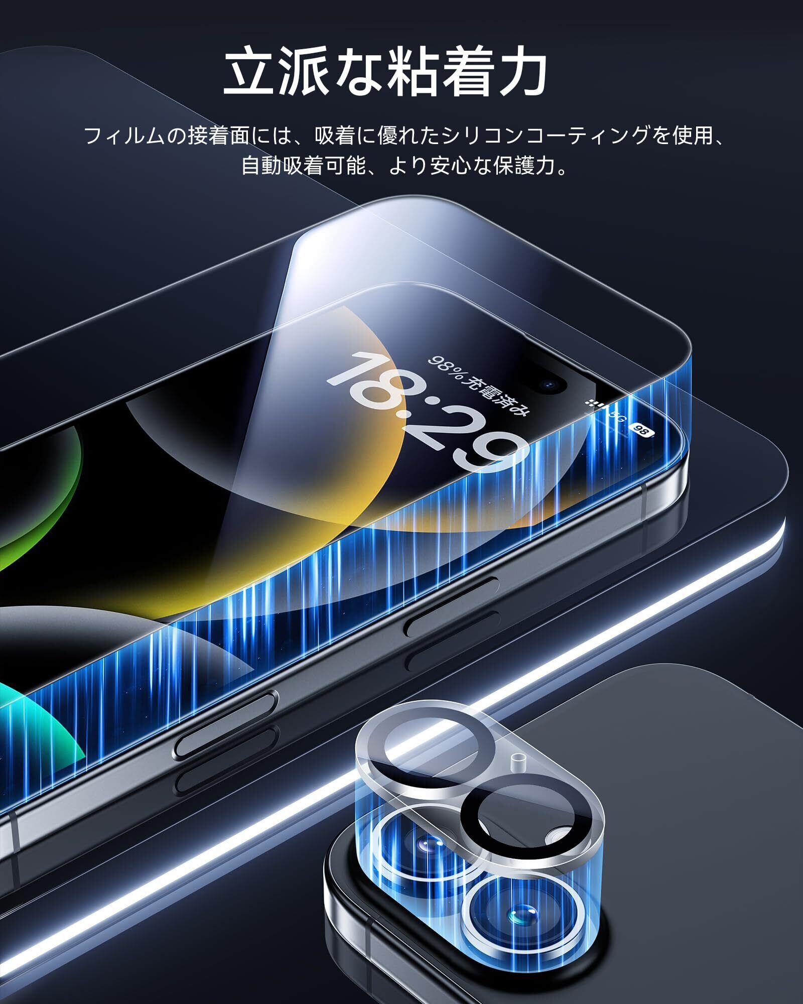 「貼付簡単・ケースと干渉しない」専用の貼り付けガイド枠が同梱されています。ガイド枠を利用することで、スマホ本体とフィルムがズレることなく、だれでも簡単にフィルムを貼ることが可能です。また、フィルム自体のシリコン自己吸着層により、位置を合わせて上から軽く置くだけで気泡が入ることなく簡単に装着できます。いPhone16Plus本体の縁まで適度なスペースを残すデザインとなっており、フィルムの剥がれや浮き上がりを防止します。ほとんどのケースと干渉しない設計となっておりますが、NIMASOのスマホケースと併用するのがおすすめです。