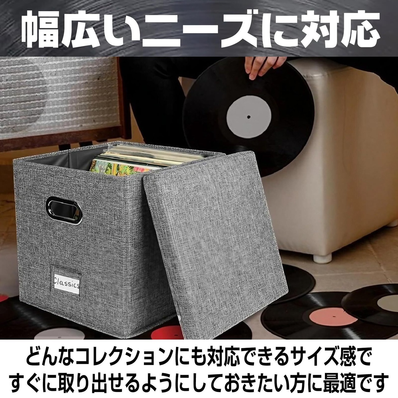 【 レコードボックス】この収納ボックスは非常に軽量でありながらも頑丈で、持ち運びにも便利です。引越しやレイアウト変更時にも、レコードの移動が簡単に行えます。どこに置いても違和感のないデザインなので、リビングや書斎、寝室にも適しています。