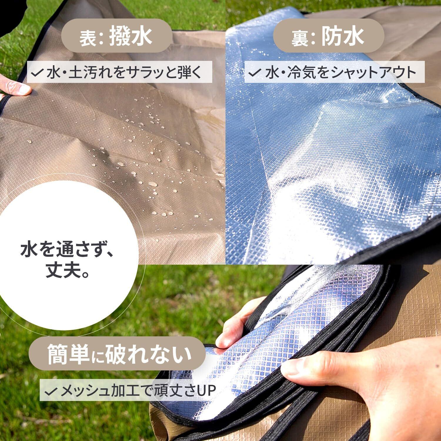 【アルミ防水】裏面|地面と接する裏面にアルミフィルムを使用しているため「防水性」「断熱性」に優れ、地面からの湿気や冷気をシャットアウトします。さらにメッシュ加工で強化しているので簡単に破れず長持ちします。/表面|ポリエステルのツルツルとした素材です。肌触りは良くないですが、ブルーシートのように水や砂や草をポロポロ弾きますのでシートが汚れにくく手入れが簡単です。