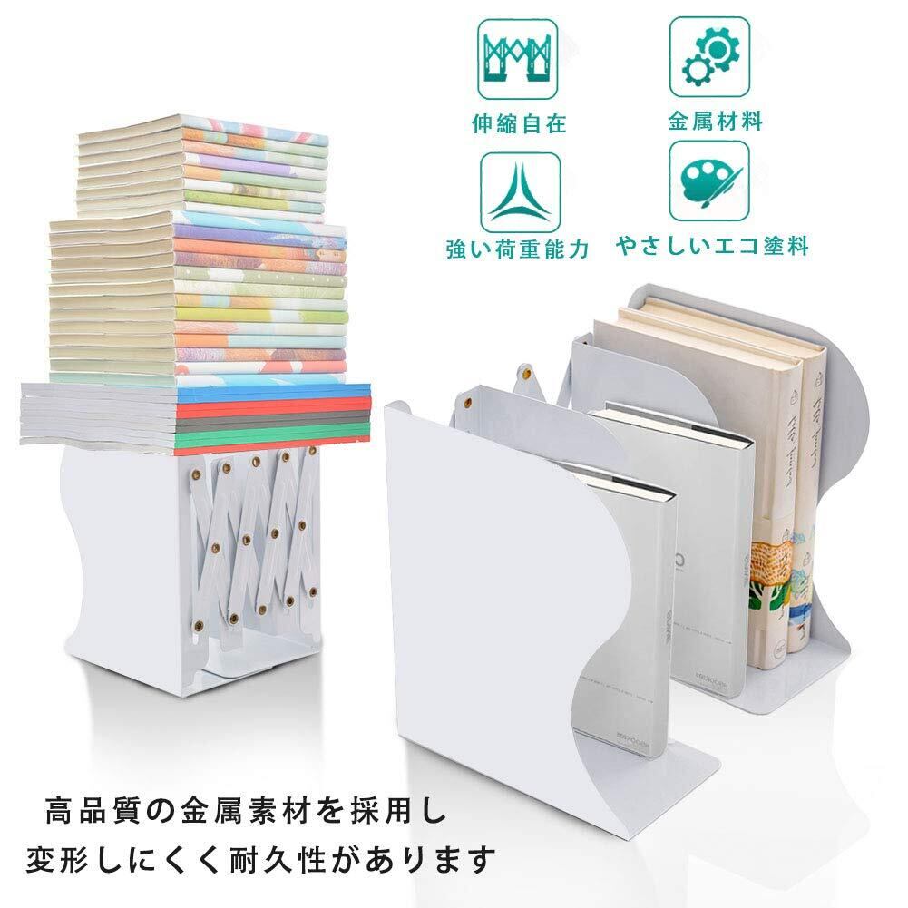 ブックエンド 本立て 伸縮自在 卓上収納 倒れない ブックスタンド 金属製 仕切りスタンド デスク整理 (ホワイト)