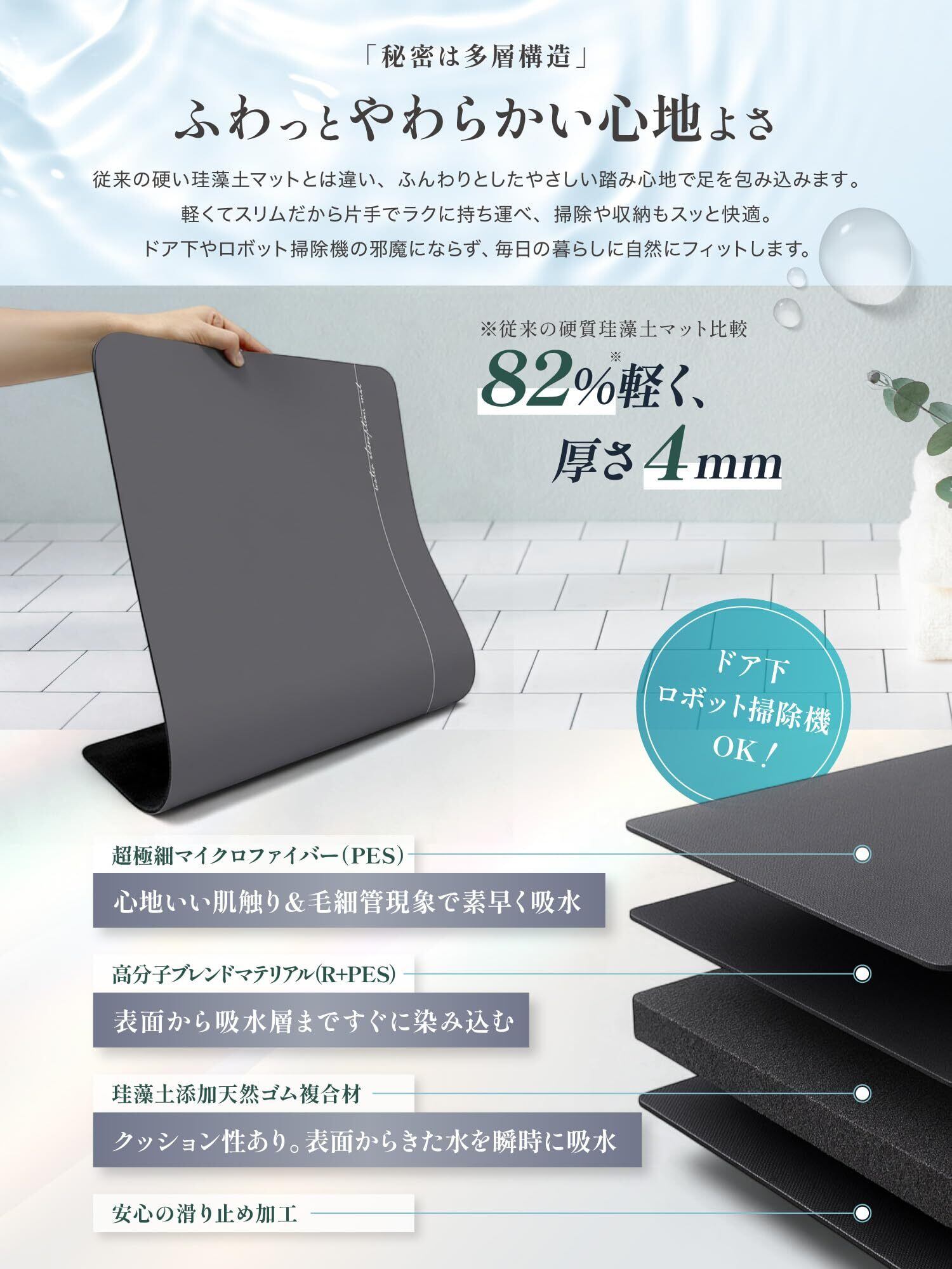 【高い吸水力】表面のナノファイバーと珪藻土が持つ独特の細かな孔構造により水分を素早く吸収し足元をすぐに乾燥させます。