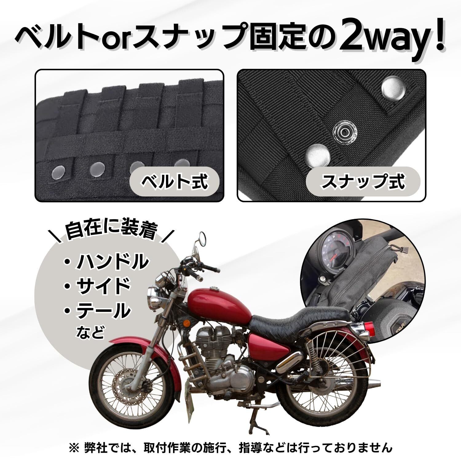 ベルト装着とボタン装着の2way機能付き!軽量で頑丈なデザインは、ツールやスマホを快適に収納できます。工具バッグやツールポーチとしての役割を果たします。ツーリングやサイクリングに欠かせないアイテムであり、ベルトを通してウエストポーチとしても使用可能なバイクサイドバッグです。 バイクに取り付けて、あなたの冒険がさらに広がります。自転車にも取り付け可能です。ツーリングバッグとして空気入れや他の必需品もすっきり収納できるので、ロードバイクライフがより充実します。フロントバッグとしても使用可能で、あなたのバイクライフをサポートします。