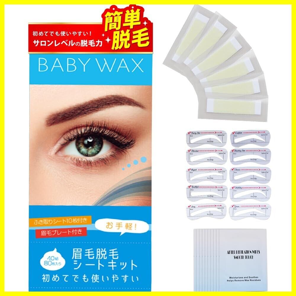 【自宅で簡単!理想の眉へ】累計売上個数25万個突破!BABY WAX 眉毛脱毛シートキット。【内容量】眉毛プレート10種・拭き取りシート10枚・脱毛シート40組80枚入り