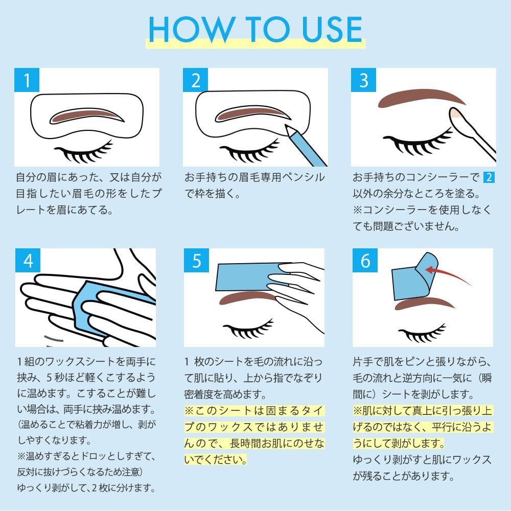 【使い方】①好みの眉プレートを眉にあてる ②眉毛ペンシルで枠を描く ③コンシーラーで余分なところを塗る ④ワックスシートを挟み、温める ⑤毛流れに沿ってシートを貼り、上から指でなぞる ⑥毛の流れと逆方向に一気にシートを剥がす