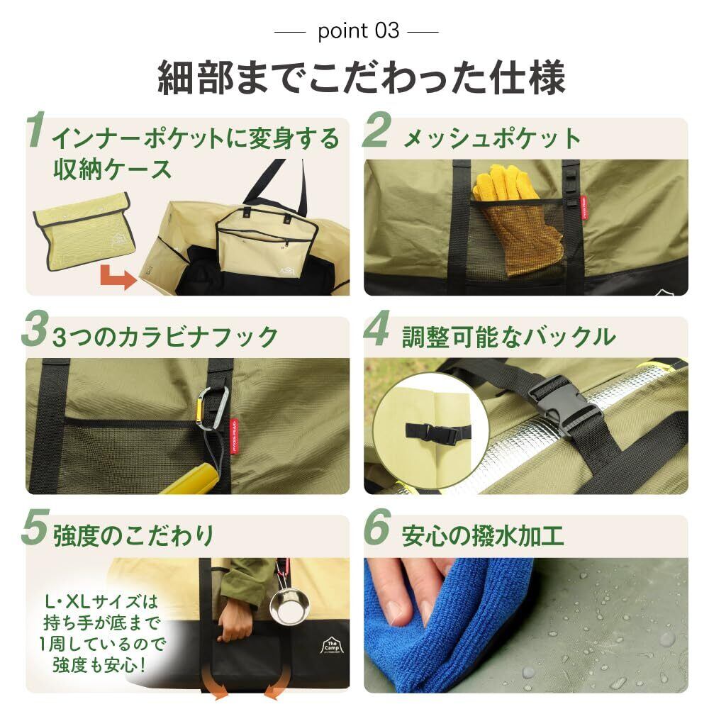 【ギアもガンガン詰め込める!キャンプで活躍の大型収納バッグ】頑丈で大容量なだけでなく、ギアの運搬をよりスムーズにするディティールを備えた高い機能性トートバッグです。テントや寝袋などの大きなギアも入るので、お気に入りのギアをたっぷりと持って行くことができ、あなたのアウトドアライフをより充実させます。収納袋付きなので、使用後はコンパクトに折りたたんで収納することができます。