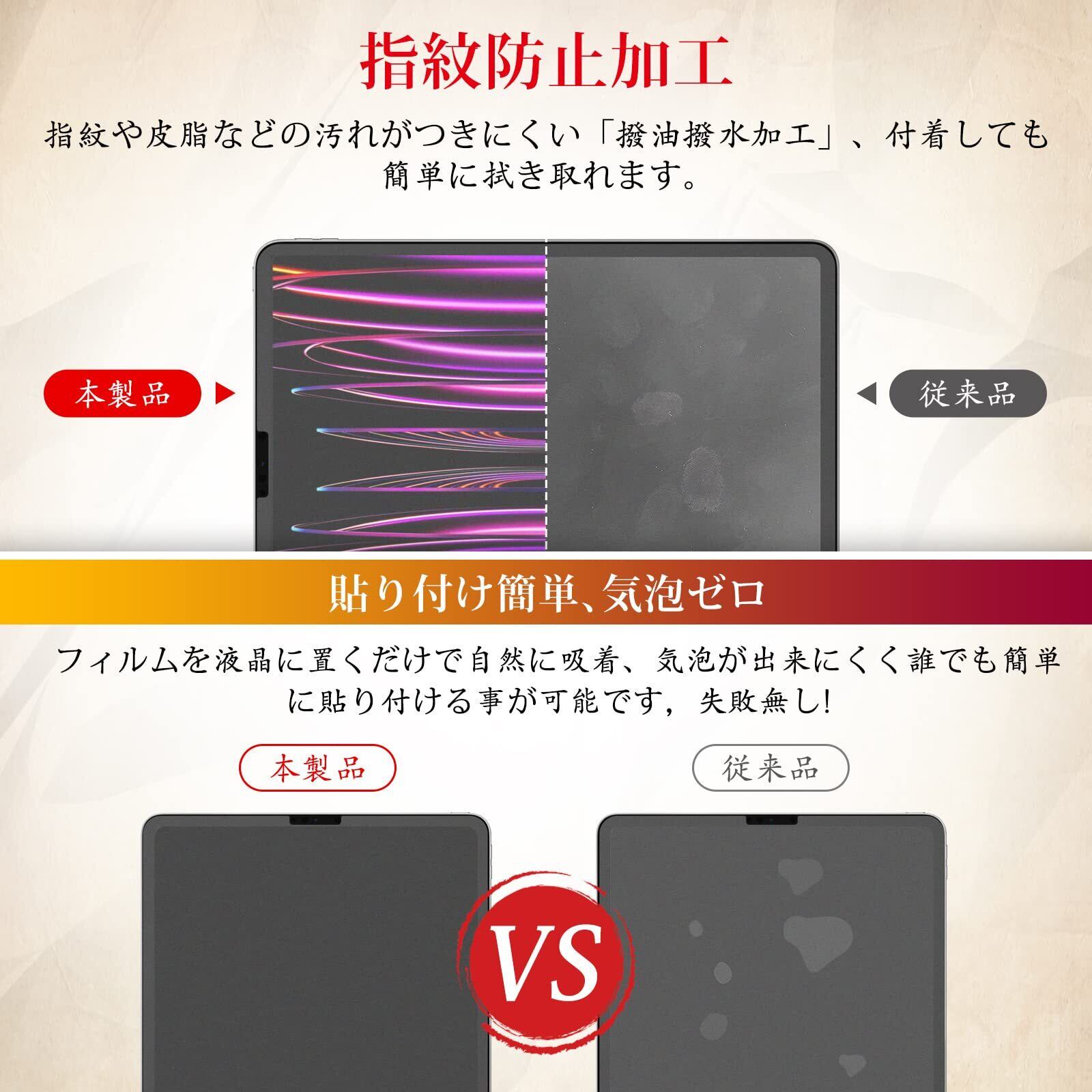 【気泡無し・簡単貼り付け】詳細なインストールガイドとビデオが付いており、初心者でも簡単に貼りつけることが できます。また、ペーパーフィルムは強い吸着力を備え、気泡やホコリが入りにくく、画面を傷付けてしまう恐れは ありません。質問があればいつまでも連絡お願いします。