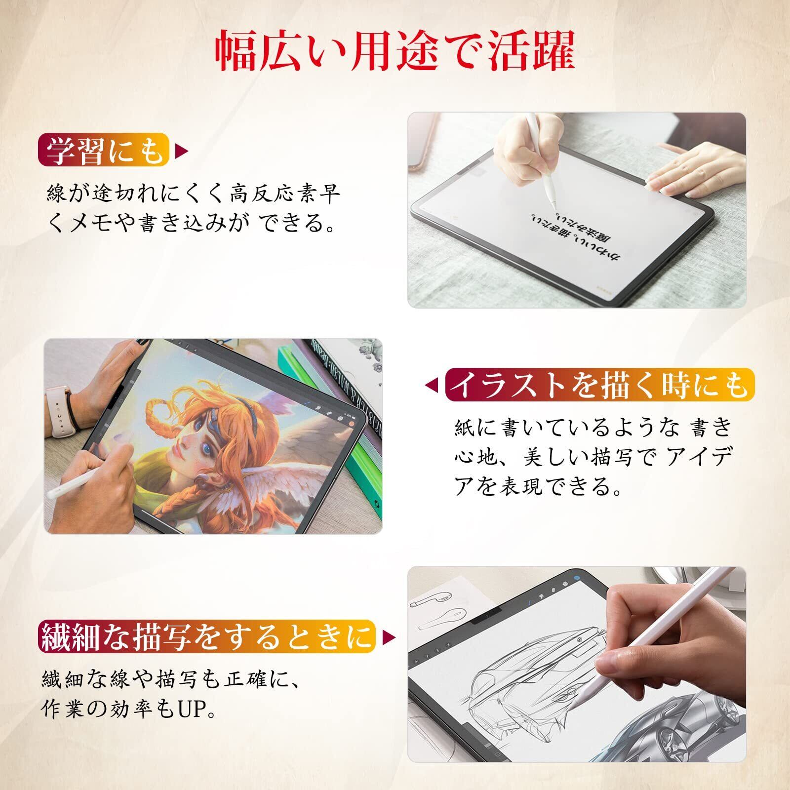 【ケント紙のような描き心地】iPad air 第5世代 ペーパーフィルムは日本からの高密度素材を採用し、適度な摩擦と抵抗力があり、文字やイラストなどを書き込む際に滑りにくく、紙のような質感を楽しめます。また、ペーパーフィルムはApple pencilと交換性があり、ストロークが滑らかでペン先磨耗も抑えられ、快適な書き心地を実現します。