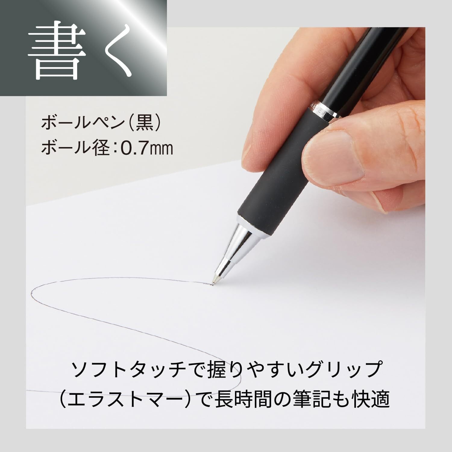 ソフトタッチで握りやすいグリップ(エラストマー)の採用により、長時間の筆記も快適にこなせる。