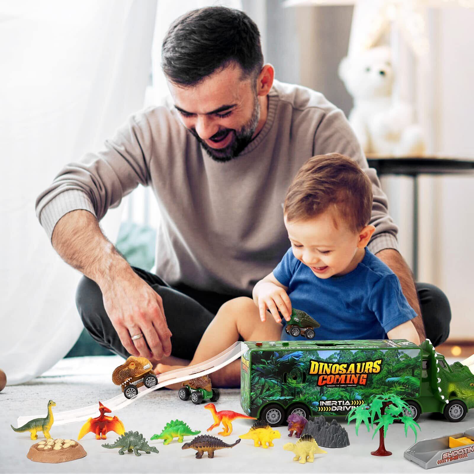 【人気の3歳 誕生日プレゼント】恐竜トラックは恐竜車3台を引き戻してどこにでも持ち運べます。トラックの3つのボタンを押すと、3つの異なる明るい色と4つの音が表示されます。 (電池を含む)