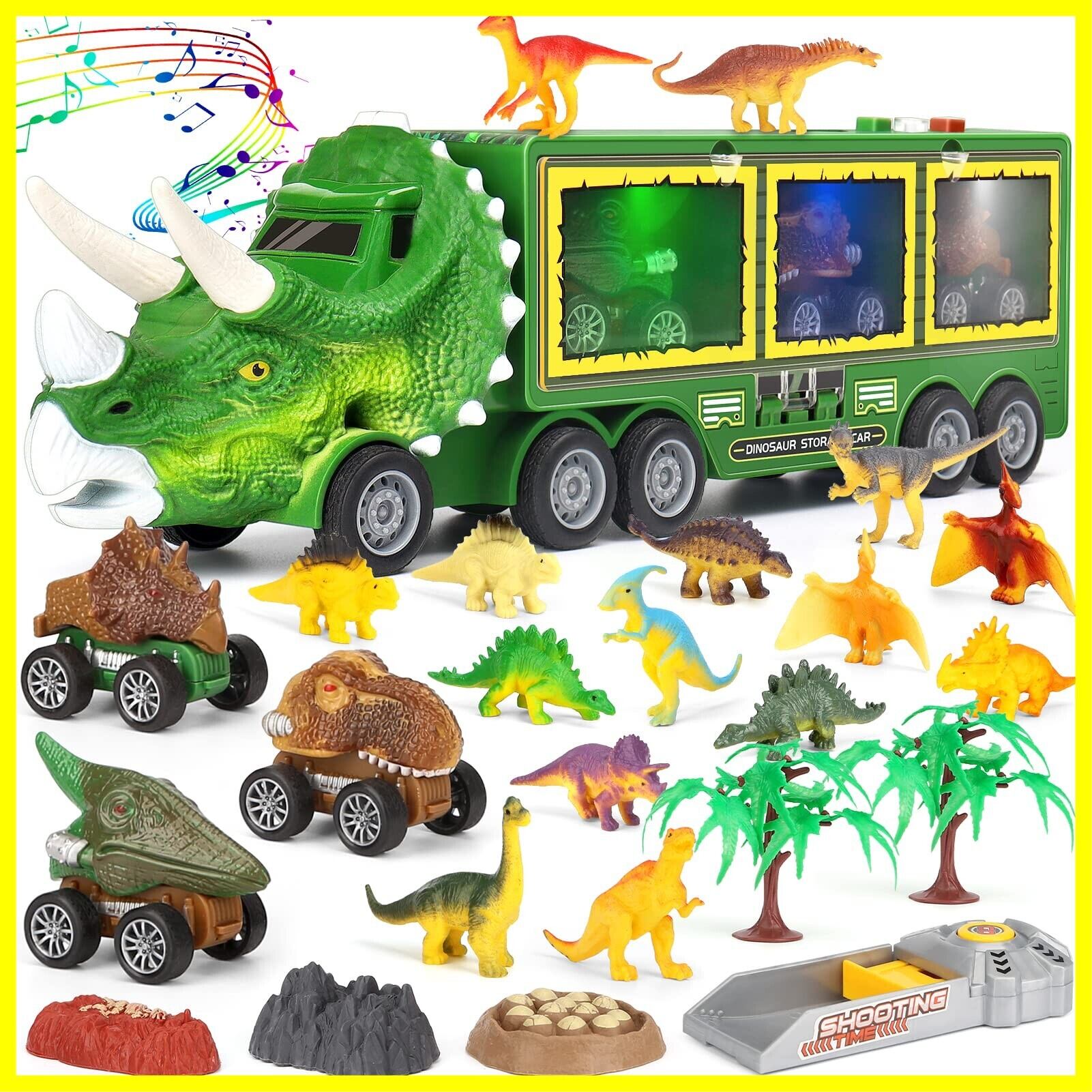 【恐竜 おもちゃ】恐竜トラック1台、引き戻し恐竜車3台、恐竜フィギュア12体、樹木2体、恐竜の卵1体、化石1体、岩1体が23個入り。重量:0.8kg