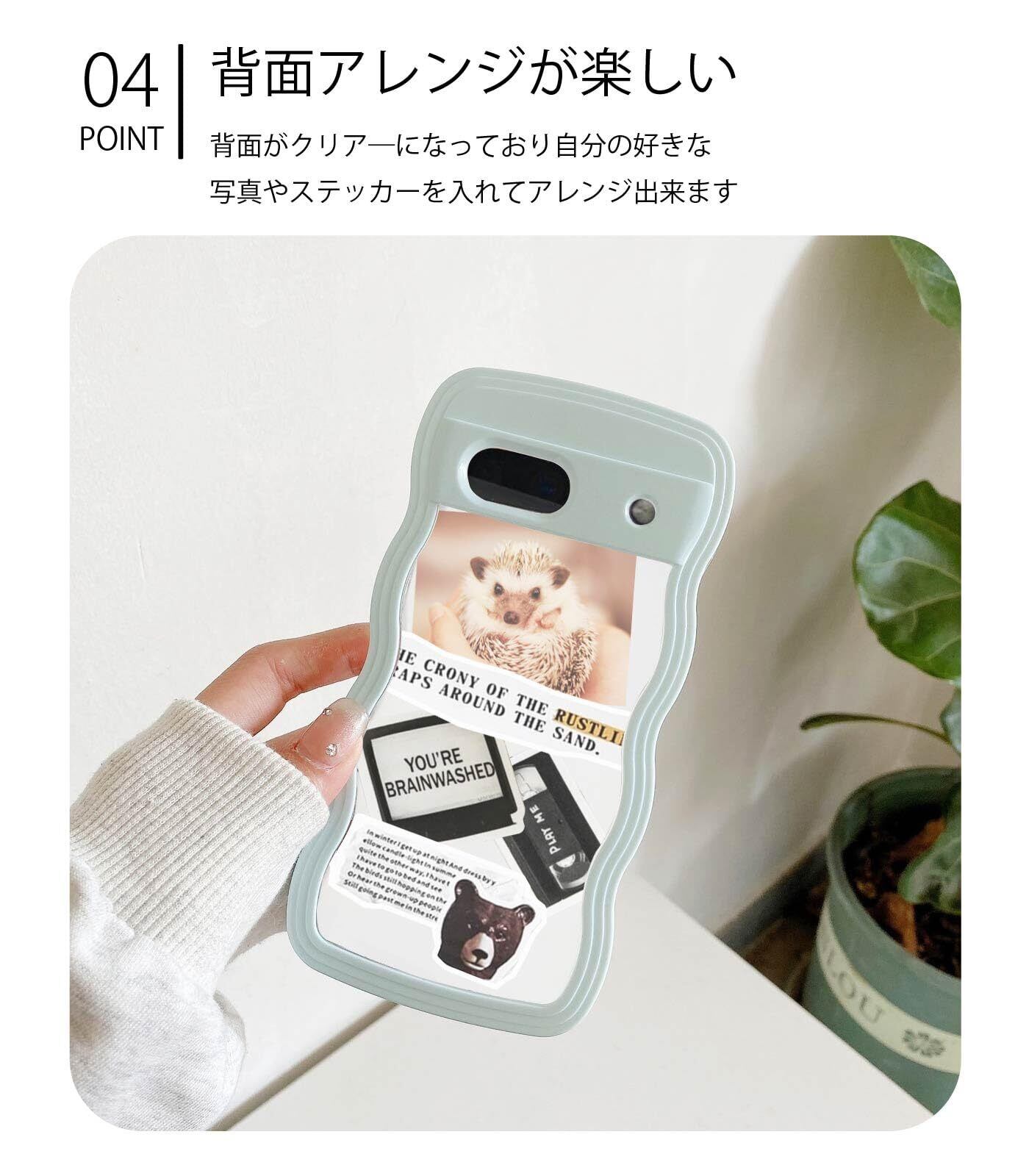 Point01.背面アレンジが楽しいケース 背面はクリアだからアレンジもしっかり楽しめます。 大切な思い出や推しを、あなた好みに詰め込んでトレンドのうねうねフレームと一緒に楽しめるスマホケースです。