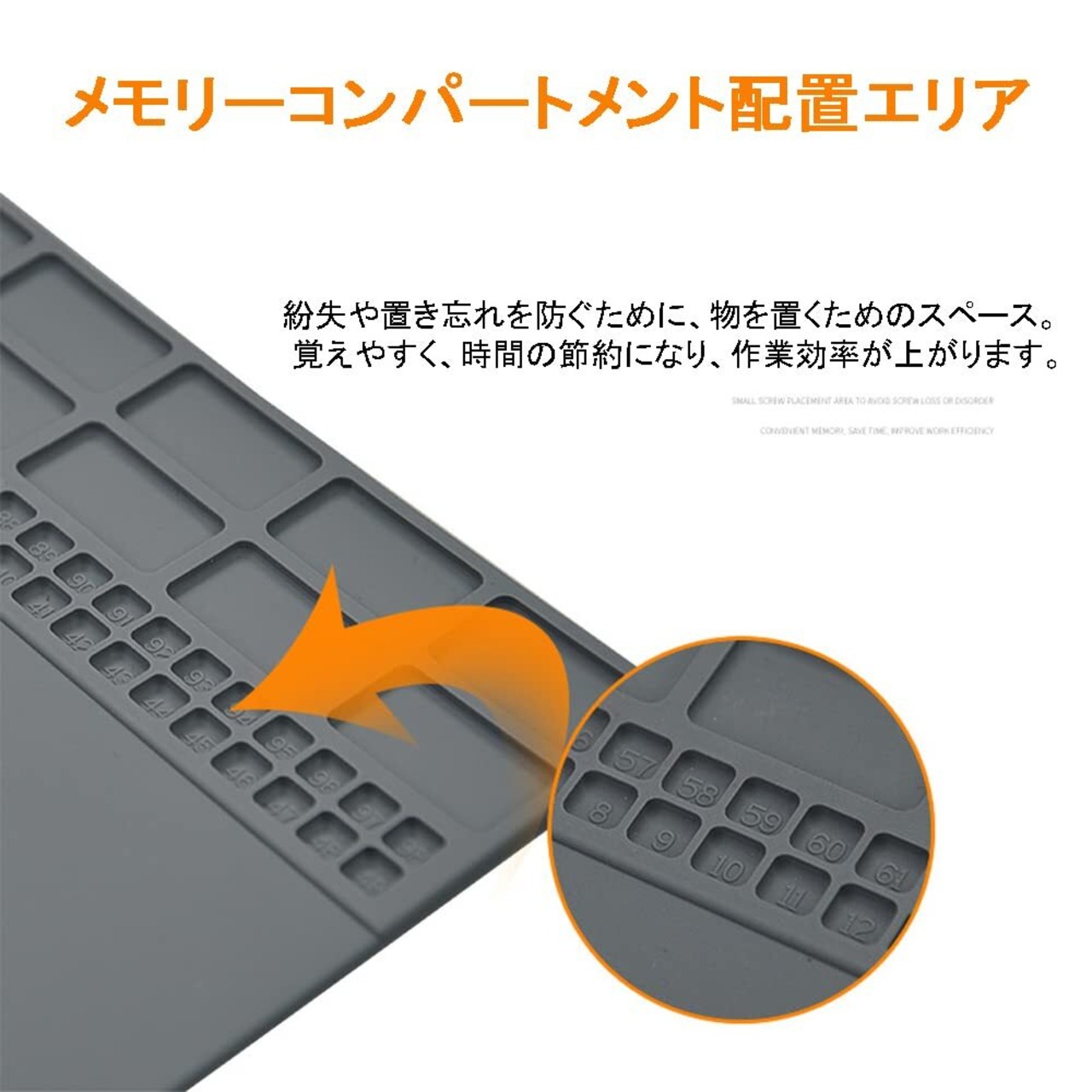 【小さなネジや部品を見逃さない】メンテナンス作業時の解体工具の整理を容易にするため、作業マットにも小さなネジを見逃さず、様々な部品を簡単に整理できるようにネジ配置の格子を設け、小さな部品の仕分けを容易にし、効率を向上させました。
