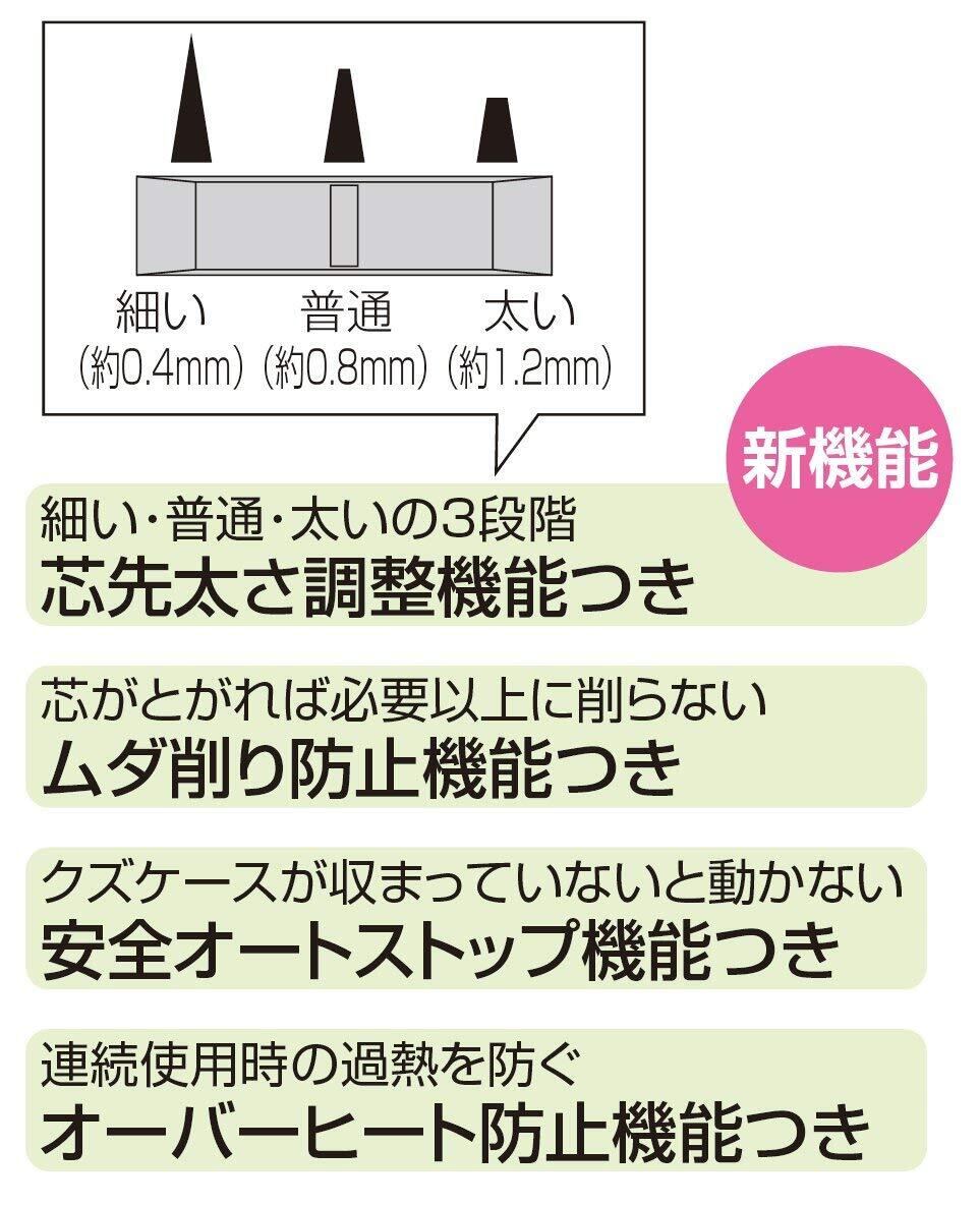芯がとがれば必要以上に削らないムダ削り防止機能つき細い・普通・太いの3段階芯先太さ調整機能つきクズケースが収まっていないと動かない安全オートストップ機能つき芯がとがれば必要以上に削らないムダ削り防止機能つき連続使用時の過熱を防ぐオーバーヒート防止機能つき